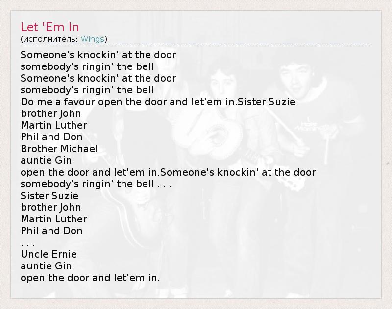 Someone's knockin' at the door somebody's ringin' the bell Someone's knockin' at the door somebody's ringin' the bell Do me a favour open the door and let'em in.Sister Suzie brother John Martin Luther Phil and Don Brother Michael auntie Gin open the door and let'em in.Someone's knockin' at the door somebody's ringin' the bell . . . Sister Suzie brother John Martin Luther Phil and Don . . . Uncle Ernie auntie Gin open the door and let'em in.
