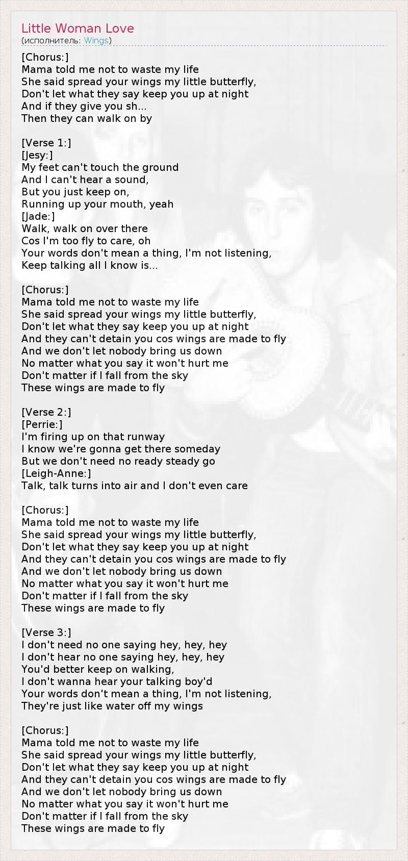 [Припев:] Мама сказала мне: "Не растрачивай свою жизнь впустую, Расправь крылья, моя малышка-бабочка, Не позволяй ничьим разговорам лишить тебя сна. А если злые языки попытаются задеть тебя, Не обращай внимания..." 1 [Куплет 1:] [Jesy:] Мои ноги не касаются земли И я не слышу не звука, Но вы продолжаете Попусту раскрывать свои рты, да! [Jade:] Так идите, идите отсюда, Потому что ваши слова меня не волнуют, да! Ваши слова ничего не значат, я их совершенно не слушаю. Продолжайте говорить, ведь я знаю, что... [Припев:] Мама сказала мне: "Не растрачивай свою жизнь впустую, Расправь крылья, моя малышка-бабочка, Не позволяй ничьим разговорам лишить тебя сна. Они не могут помешать тебе, ведь тебе даны крылья для полета." И мы не позволим никому сломить нас, Что бы вы ни говорили, меня это не ранит. Ведь даже если я упаду с небес, Мне даны крылья для полета... [Куплет 2:] [Perrie:] Я только в начале пути, Я знаю, когда-нибудь мы добьемся многого, Нам не нужны ваши команды: "На старт! Внимание! Марш!" [Leigh-Anne:] Ваша болтовня витает в воздухе, а мне все равно. [Припев:] Мама сказала мне: "Не растрачивай свою жизнь впустую, Расправь крылья, моя малышка-бабочка, Не позволяй ничьим разговорам лишить тебя сна. Они не могут помешать тебе, ведь тебе даны крылья для полета." И мы не позволим никому сломить нас, Что бы вы ни говорили, меня это не ранит. Ведь даже если я упаду с небес, Мне даны крылья для полета... [Куплет 3:] Мне не нужно, чтобы кто-нибудь говорил: "Эй! Эй! Эй!", Я не слышу, когда вы мне говорите: "Эй! Эй! Эй!", Лучше проходи мимо, Я не желаю слушать твою болтовню, парень. Ваши слова ничего не значат, я не слушаю, Они как вода, стекающая с моих крыльев. [Припев:] Мама сказала мне: "Не растрачивай свою жизнь впустую, Расправь крылья, моя малышка-бабочка, Не позволяй ничьим разговорам лишить тебя сна. Они не могут помешать тебе, ведь тебе даны крылья для полета." И мы не позволим никому сломить нас, Что бы вы ни говорили, меня это не ранит. Ведь даже если я упаду с небес, Мне даны крылья для полета... 1 - дословно: То пусть они проходят мимо