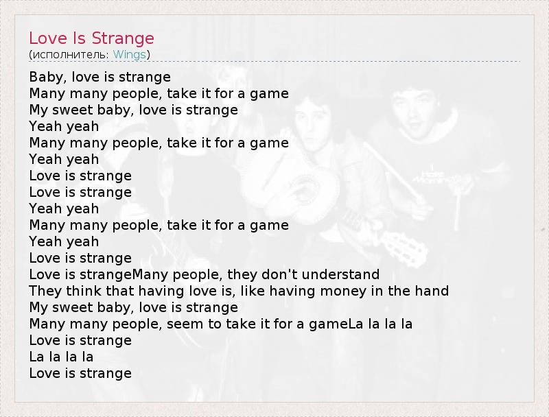 Baby, love is strange Many many people, take it for a game My sweet baby, love is strange Yeah yeah Many many people, take it for a game Yeah yeah Love is strange Love is strange Yeah yeah Many many people, take it for a game Yeah yeah Love is strange Love is strangeMany people, they don't understand They think that having love is, like having money in the hand My sweet baby, love is strange Many many people, seem to take it for a gameLa la la la Love is strange La la la la Love is strange