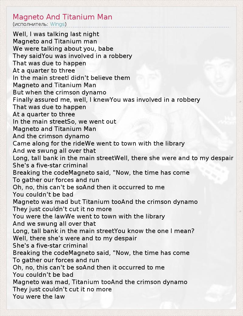А как ты думаешь, о чем песня "Magneto And Titanium Man" ?