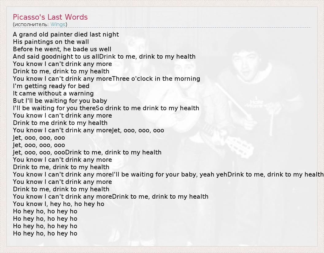 A grand old painter died last night His paintings on the wall Before he went, he bade us well And said goodnight to us allDrink to me, drink to my health You know I can't drink any more Drink to me, drink to my health You know I can't drink any moreThree o'clock in the morning I'm getting ready for bed It came without a warning But I'll be waiting for you baby I'll be waiting for you thereSo drink to me drink to my health You know I can't drink any more Drink to me drink to my health You know I can't drink any moreJet, ooo, ooo, ooo Jet, ooo, ooo, ooo Jet, ooo, ooo, ooo Jet, ooo, ooo, oooDrink to me, drink to my health You know I can't drink any more Drink to me, drink to my health You know I can't drink any moreI'll be waiting for your baby, yeah yehDrink to me, drink to my health You know I can't drink any more Drink to me, drink to my health You know I can't drink any moreDrink to me, drink to my health You know I, hey ho, ho hey ho Ho hey ho, ho hey ho Ho hey ho, ho hey ho Ho hey ho, ho hey ho Ho hey ho, ho hey ho