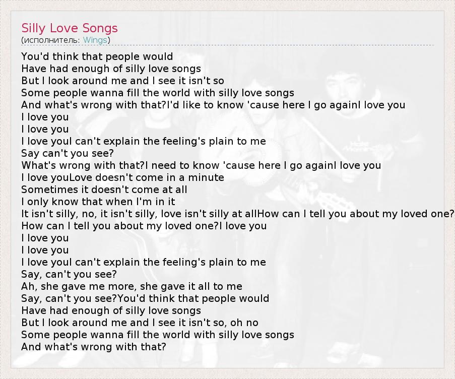 You'd think that people would Have had enough of silly love songs But I look around me and I see it isn't so Some people wanna fill the world with silly love songs And what's wrong with that?I'd like to know 'cause here I go againI love you I love you I love you I love youI can't explain the feeling's plain to me Say can't you see? What's wrong with that?I need to know 'cause here I go againI love you I love youLove doesn't come in a minute Sometimes it doesn't come at all I only know that when I'm in it It isn't silly, no, it isn't silly, love isn't silly at allHow can I tell you about my loved one? How can I tell you about my loved one?I love you I love you I love you I love youI can't explain the feeling's plain to me Say, can't you see? Ah, she gave me more, she gave it all to me Say, can't you see?You'd think that people would Have had enough of silly love songs But I look around me and I see it isn't so, oh no Some people wanna fill the world with silly love songs And what's wrong with that?