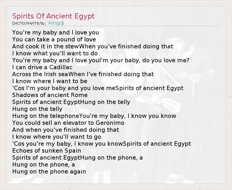 You're my baby and I love you You can take a pound of love And cook it in the stewWhen you've finished doing that I know what you'll want to do You're my baby and I love youI'm your baby, do you love me? I can drive a Cadillac Across the Irish seaWhen I've finished doing that I know where I want to be 'Cos I'm your baby and you love meSpirits of ancient Egypt Shadows of ancient Rome Spirits of ancient EgyptHung on the telly Hung on the telly Hung on the telephoneYou're my baby, I know you know You could sell an elevator to Geronimo And when you've finished doing that I know where you'll want to go 'Cos you're my baby, I know you knowSpirits of ancient Egypt Echoes of sunken Spain Spirits of ancient EgyptHung on the phone, a Hung on the phone, a Hung on the phone again