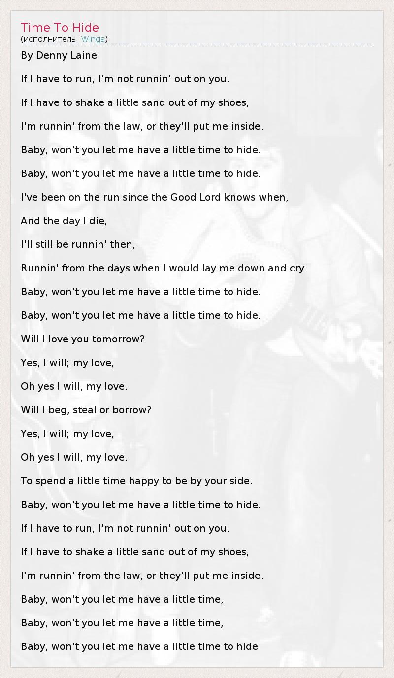 By Denny Laine If I have to run, I'm not runnin' out on you. If I have to shake a little sand out of my shoes, I'm runnin' from the law, or they'll put me inside. Baby, won't you let me have a little time to hide. Baby, won't you let me have a little time to hide. I've been on the run since the Good Lord knows when, And the day I die, I'll still be runnin' then, Runnin' from the days when I would lay me down and cry. Baby, won't you let me have a little time to hide. Baby, won't you let me have a little time to hide. Will I love you tomorrow? Yes, I will; my love, Oh yes I will, my love. Will I beg, steal or borrow? Yes, I will; my love, Oh yes I will, my love. To spend a little time happy to be by your side. Baby, won't you let me have a little time to hide. If I have to run, I'm not runnin' out on you. If I have to shake a little sand out of my shoes, I'm runnin' from the law, or they'll put me inside. Baby, won't you let me have a little time, Baby, won't you let me have a little time, Baby, won't you let me have a little time to hide
