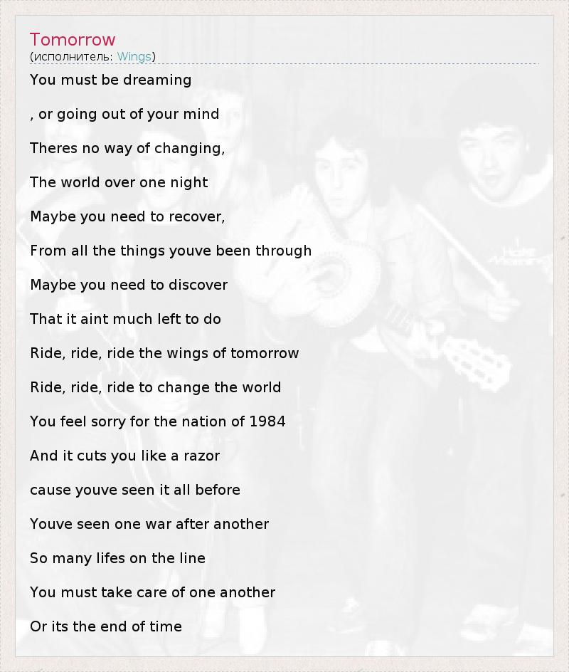 Крылья завтрашнего дня Вы должно быть грезите, Или вы сошли с ума. Не получится изменить Мир за одну ночь. Быть может вам нужно прийти в себя От всего, через что ва прошли. Быть может вам нужно узнать Что осталось не так много сделать. Скользите, скользите, скользите, крылья завтрашнего дня. Скользите, скользите, скользите, чтобы изменить мир. Вам жаль нацию, живущую в 1984 году И это режет вас как бритва. Ведь всё это видели вы раньше. Вы видели войну за войной, Так много жизней, что подверглись риску. Вы должны заботиться друг о друге Или это будет концом света. Перевод: Sanchez © lyrsense.com