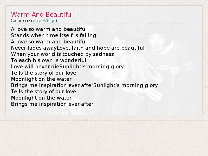 А как ты думаешь, о чем песня "Warm And Beautiful" ?