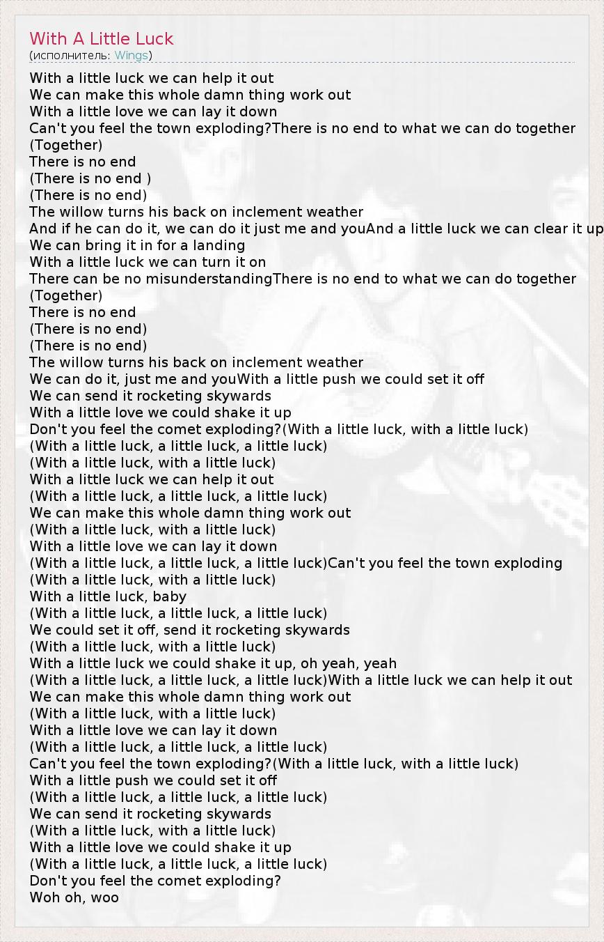 With a little luck we can help it out We can make this whole damn thing work out With a little love we can lay it down Can't you feel the town exploding?There is no end to what we can do together (Together) There is no end (There is no end ) (There is no end) The willow turns his back on inclement weather And if he can do it, we can do it just me and youAnd a little luck we can clear it up We can bring it in for a landing With a little luck we can turn it on There can be no misunderstandingThere is no end to what we can do together (Together) There is no end (There is no end) (There is no end) The willow turns his back on inclement weather We can do it, just me and youWith a little push we could set it off We can send it rocketing skywards With a little love we could shake it up Don't you feel the comet exploding?(With a little luck, with a little luck) (With a little luck, a little luck, a little luck) (With a little luck, with a little luck) With a little luck we can help it out (With a little luck, a little luck, a little luck) We can make this whole damn thing work out (With a little luck, with a little luck) With a little love we can lay it down (With a little luck, a little luck, a little luck)Can't you feel the town exploding (With a little luck, with a little luck) With a little luck, baby (With a little luck, a little luck, a little luck) We could set it off, send it rocketing skywards (With a little luck, with a little luck) With a little luck we could shake it up, oh yeah, yeah (With a little luck, a little luck, a little luck)With a little luck we can help it out We can make this whole damn thing work out (With a little luck, with a little luck) With a little love we can lay it down (With a little luck, a little luck, a little luck) Can't you feel the town exploding?(With a little luck, with a little luck) With a little push we could set it off (With a little luck, a little luck, a little luck) We can send it rocketing skywards (With a little luck, with a little luck) With a little love we could shake it up (With a little luck, a little luck, a little luck) Don't you feel the comet exploding? Woh oh, woo