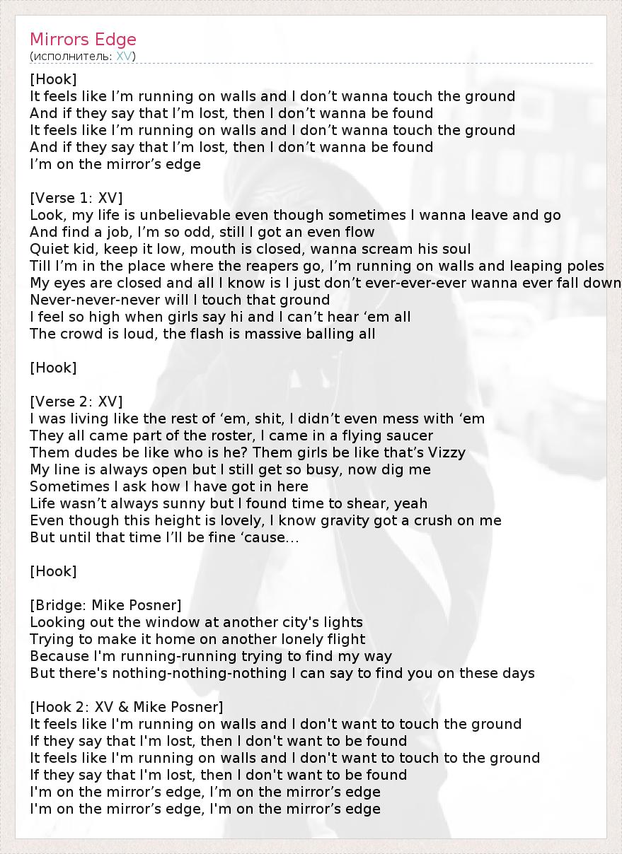 [Hook] It feels like I’m running on walls and I don’t wanna touch the ground And if they say that I’m lost, then I don’t wanna be found It feels like I’m running on walls and I don’t wanna touch the ground And if they say that I’m lost, then I don’t wanna be found I’m on the mirror’s edge [Verse 1: XV] Look, my life is unbelievable even though sometimes I wanna leave and go And find a job, I’m so odd, still I got an even flow Quiet kid, keep it low, mouth is closed, wanna scream his soul Till I’m in the place where the reapers go, I’m running on walls and leaping poles My eyes are closed and all I know is I just don’t ever-ever-ever wanna ever fall down Never-never-never will I touch that ground I feel so high when girls say hi and I can’t hear ‘em all The crowd is loud, the flash is massive balling all [Hook] [Verse 2: XV] I was living like the rest of ‘em, shit, I didn’t even mess with ‘em They all came part of the roster, I came in a flying saucer Them dudes be like who is he? Them girls be like that’s Vizzy My line is always open but I still get so busy, now dig me Sometimes I ask how I have got in here Life wasn’t always sunny but I found time to shear, yeah Even though this height is lovely, I know gravity got a crush on me But until that time I’ll be fine ‘cause… [Hook] [Bridge: Mike Posner] Looking out the window at another city's lights Trying to make it home on another lonely flight Because I'm running-running trying to find my way But there's nothing-nothing-nothing I can say to find you on these days [Hook 2: XV & Mike Posner] It feels like I'm running on walls and I don't want to touch the ground If they say that I'm lost, then I don't want to be found It feels like I'm running on walls and I don't want to touch to the ground If they say that I'm lost, then I don't want to be found I'm on the mirror’s edge, I’m on the mirror’s edge I'm on the mirror’s edge, I'm on the mirror’s edge
