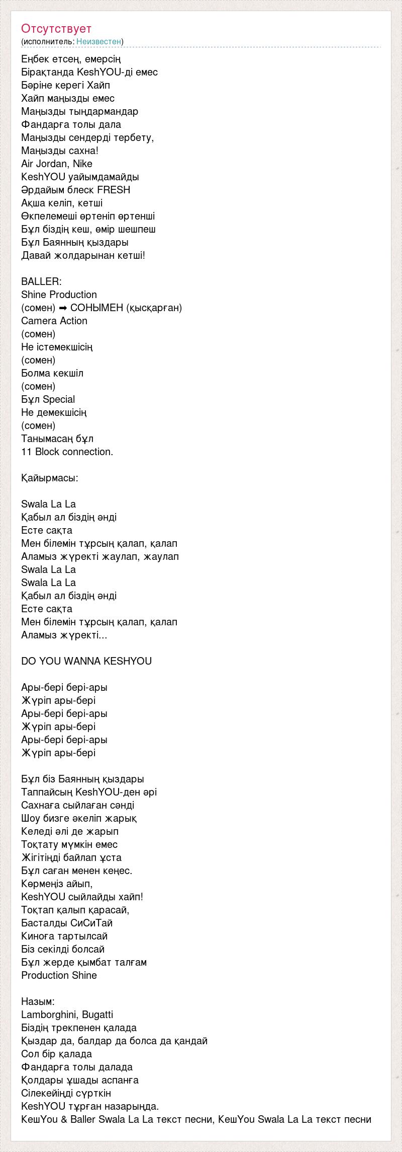 Еңбек етсең, емерсің Бiрақтанда KeshYOU-ді емес Бәріне керегі Хайп Хайп маңызды емес Маңызды тыңдармандар Фандарға толы дала Маңызды сендерді тербету, Маңызды саxна! Air Jordan, Nike КеshYOU уайымдамайды Әрдайым блеск FRESH Ақша келіп, кетші Өкпелемеші өртеніп өртенші Бұл біздің кеш, өмiр шешпеш Бұл Баянның қыздары Давай жолдарынан кетші! BALLER: Shine Production (сомен) ➡ СОНЫМЕН (қысқарған) Camera Action (сомен) Не істемекшісің (сомен) Болма кекшіл (сомен) Бұл Special Не демекшісің (сомен) Танымасаң бұл 11 Block connection. Қайырмасы: Swala La La Қабыл ал біздің әнді Есте сақта Мен білемін тұрсың қалап, қалап Аламыз жүректі жаулап, жаулап Swala La La Swala La La Қабыл ал біздің әнді Есте сақта Мен білемін тұрсың қалап, қалап Аламыз жүректі... DO YOU WANNA KESHYOU Ары-бері бері-ары Жүріп ары-бері Ары-бері бері-ары Жүріп ары-бері Ары-бері бері-ары Жүріп ары-бері Бұл бiз Баянның қыздары Таппайсың KeshYOU-ден әрі Саxнаға сыйлаған сәнді Шоу бизге әкеліп жарық Келеді әлі де жарып Тоқтату мүмкін емес Жігітіңді байлап ұста Бұл саған менен кеңес. Көрмеңіз айып, KeshYOU сыйлайды xайп! Тоқтап қалып қарасай, Басталды СиСиТай Киноға тартылсай Біз секілді болсай Бұл жерде қымбат талғам Production Shine Назым: Lamborghini, Bugatti Біздiң трекпенен қалада Қыздар да, балдар да болса да қандай Сол бір қалада Фандарға толы далада Қолдары ұшады аспанға Сілекейіңді сүрткін KeshYOU тұрған назарыңда. КешYou & Baller Swala La La текст песни, КешYou Swala La La текст песни