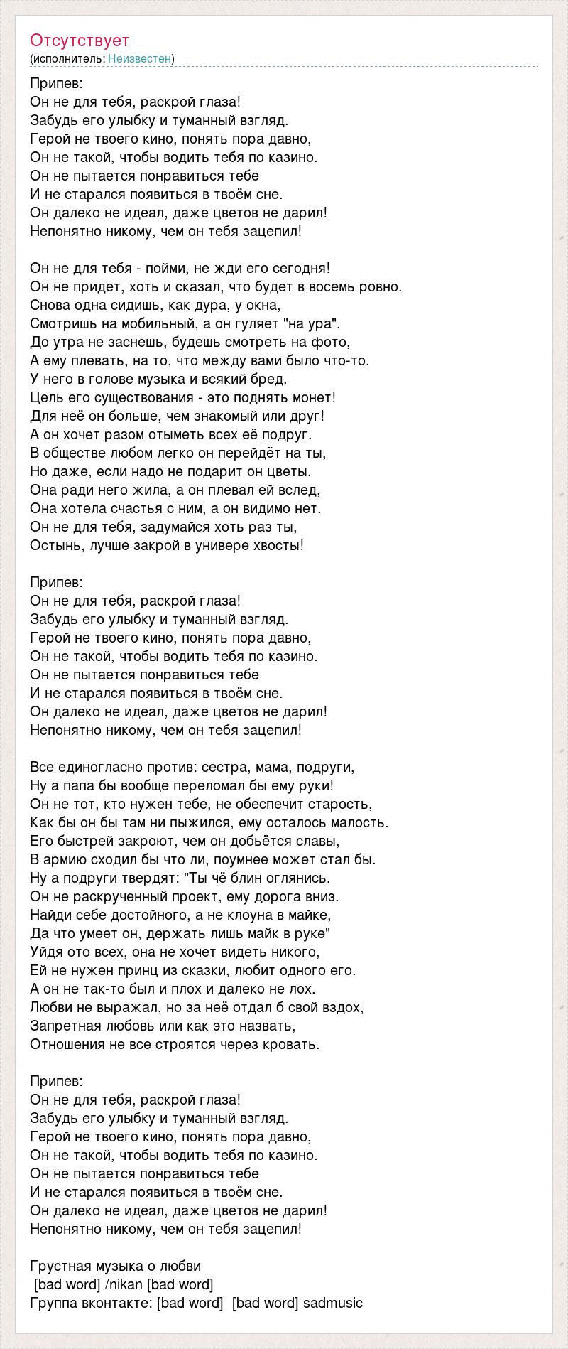 Припев: Он не для тебя, раскрой глаза! Забудь его улыбку и туманный взгляд. Герой не твоего кино, понять пора давно, Он не такой, чтобы водить тебя по казино. Он не пытается понравиться тебе И не старался появиться в твоём сне. Он далеко не идеал, даже цветов не дарил! Непонятно никому, чем он тебя зацепил! Он не для тебя - пойми, не жди его сегодня! Он не придет, хоть и сказал, что будет в восемь ровно. Снова одна сидишь, как дура, у окна, Смотришь на мобильный, а он гуляет "на ура". До утра не заснешь, будешь смотреть на фото, А ему плевать, на то, что между вами было что-то. У него в голове музыка и всякий бред. Цель его существования - это поднять монет! Для неё он больше, чем знакомый или друг! А он хочет разом отыметь всех её подруг. В обществе любом легко он перейдёт на ты, Но даже, если надо не подарит он цветы. Она ради него жила, а он плевал ей вслед, Она хотела счастья с ним, а он видимо нет. Он не для тебя, задумайся хоть раз ты, Остынь, лучше закрой в универе хвосты! Припев: Он не для тебя, раскрой глаза! Забудь его улыбку и туманный взгляд. Герой не твоего кино, понять пора давно, Он не такой, чтобы водить тебя по казино. Он не пытается понравиться тебе И не старался появиться в твоём сне. Он далеко не идеал, даже цветов не дарил! Непонятно никому, чем он тебя зацепил! Все единогласно против: сестра, мама, подруги, Ну а папа бы вообще переломал бы ему руки! Он не тот, кто нужен тебе, не обеспечит старость, Как бы он бы там ни пыжился, ему осталось малость. Его быстрей закроют, чем он добьётся славы, В армию сходил бы что ли, поумнее может стал бы. Ну а подруги твердят: "Ты чё блин оглянись. Он не раскрученный проект, ему дорога вниз. Найди себе достойного, а не клоуна в майке, Да что умеет он, держать лишь майк в руке" Уйдя ото всех, она не хочет видеть никого, Ей не нужен принц из сказки, любит одного его. А он не так-то был и плох и далеко не лох. Любви не выражал, но за неё отдал б свой вздох, Запретная любовь или как это назвать, Отношения не все строятся через кровать. Припев: Он не для тебя, раскрой глаза! Забудь его улыбку и туманный взгляд. Герой не твоего кино, понять пора давно, Он не такой, чтобы водить тебя по казино. Он не пытается понравиться тебе И не старался появиться в твоём сне. Он далеко не идеал, даже цветов не дарил! Непонятно никому, чем он тебя зацепил! Грустная музыка о любви [bad word] /nikan [bad word] Группа вконтакте: [bad word] [bad word] sadmusic
