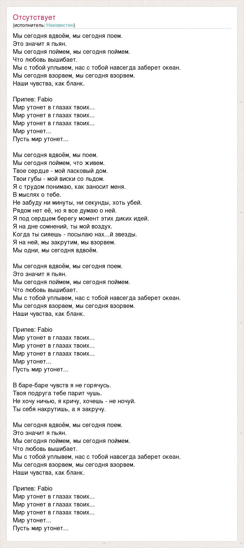 Мы сегодня вдвоём, мы сегодня поем. Это значит я пьян. Мы сегодня поймем, мы сегодня поймем. Что любовь вышибает. Мы с тобой уплывем, нас с тобой навсегда заберет океан. Мы сегодня взорвем, мы сегодня взорвем. Наши чувства, как бланк. Припев: Fabio Мир утонет в глазах твоих... Мир утонет в глазах твоих... Мир утонет в глазах твоих... Мир утонет... Пусть мир утонет... Мы сегодня вдвоём, мы поем. Мы сегодня поймем, что живем. Твое сердце - мой ласковый дом. Твои губы - мой виски со льдом. Я с трудом понимаю, как заносит меня. В мыслях о тебе. Не забуду ни минуты, ни секунды, хоть убей. Рядом нет её, но я все думаю о ней. Я под сердцем берегу момент этих диких идей. Я на дне сомнений, ты мой воздух. Когда ты сияешь - посылаю нах...й звезды. Я на ней, мы закрутим, мы взорвем. Мы одни, мы сегодня вдвоём. Мы сегодня вдвоём, мы сегодня поем. Это значит я пьян. Мы сегодня поймем, мы сегодня поймем. Что любовь вышибает. Мы с тобой уплывем, нас с тобой навсегда заберет океан. Мы сегодня взорвем, мы сегодня взорвем. Наши чувства, как бланк. Припев: Fabio Мир утонет в глазах твоих... Мир утонет в глазах твоих... Мир утонет в глазах твоих... Мир утонет... Пусть мир утонет... В баре-баре чувств я не горячусь. Твоя подруга тебе парит чушь. Не хочу ничью, я кричу, хочешь - не ночуй. Ты себя накрутишь, а я закручу. Мы сегодня вдвоём, мы сегодня поем. Это значит я пьян. Мы сегодня поймем, мы сегодня поймем. Что любовь вышибает. Мы с тобой уплывем, нас с тобой навсегда заберет океан. Мы сегодня взорвем, мы сегодня взорвем. Наши чувства, как бланк. Припев: Fabio Мир утонет в глазах твоих... Мир утонет в глазах твоих... Мир утонет в глазах твоих... Мир утонет... Пусть мир утонет...