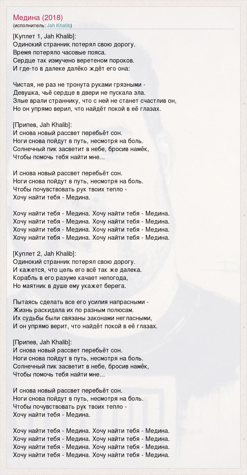 [Куплет 1, Jah Khalib]: Одинокий странник потерял свою дорогу. Время потеряло часовые пояса. Сердце так измучено веретеном пороков. И где-то в далеке далёко ждёт его она: Чистая, не раз не тронута руками грязными - Девушка, чьё сердце в двери не пускала зла. Злые врали страннику, что с ней не станет счастлив он, Но он упрямо верил, что найдёт покой в её глазах. [Припев, Jah Khalib]: И снова новый рассвет перебьёт сон. Ноги снова пойдут в путь, несмотря на боль. Солнечный пик засветит в небе, бросив намёк, Чтобы помочь тебя найти мне... И снова новый рассвет перебьёт сон. Ноги снова пойдут в путь, несмотря на боль. Чтобы почувствовать рук твоих тепло - Хочу найти тебя - Медина. Хочу найти тебя - Медина. Хочу найти тебя - Медина. Хочу найти тебя - Медина. Хочу найти тебя - Медина. Хочу найти тебя - Медина. Хочу найти тебя - Медина. Хочу найти тебя - Медина. Хочу найти тебя - Медина. [Куплет 2, Jah Khalib]: Одинокий странник потерял свою дорогу. И кажется, что цель его всё так же далека. Корабль в его разуме качает непогода, Но маятник в душе ему укажет берега. Пытаясь сделать все его усилия напрасными - Жизнь раскидала их по разным полюсам. Их судьбы были связаны законами негласными, И он упрямо верит, что найдёт покой в её глазах. [Припев, Jah Khalib]: И снова новый рассвет перебьёт сон. Ноги снова пойдут в путь, несмотря на боль. Солнечный пик засветит в небе, бросив намёк, Чтобы помочь тебя найти мне... И снова новый рассвет перебьёт сон. Ноги снова пойдут в путь, несмотря на боль. Чтобы почувствовать рук твоих тепло - Хочу найти тебя - Медина. Хочу найти тебя - Медина. Хочу найти тебя - Медина. Хочу найти тебя - Медина. Хочу найти тебя - Медина. Хочу найти тебя - Медина. Хочу найти тебя - Медина. Хочу найти тебя - Медина. Хочу найти тебя - Медина.