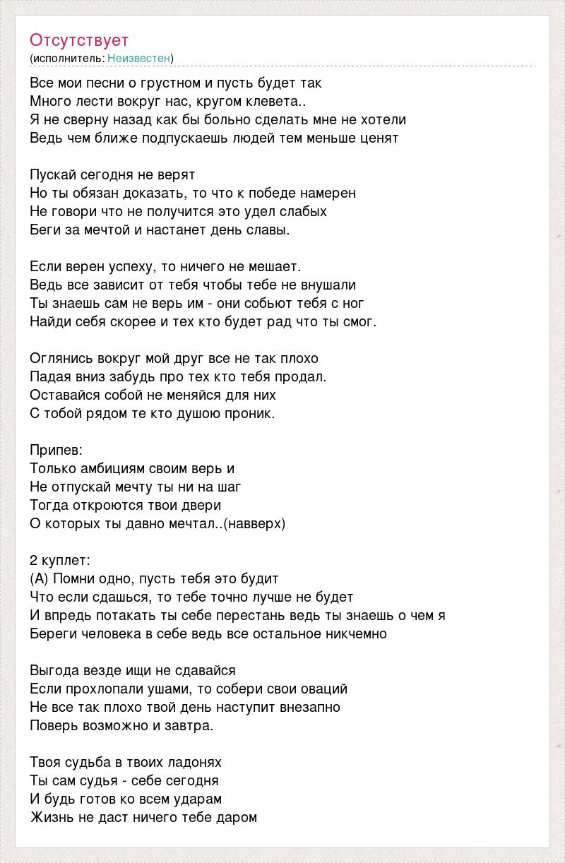 Все мои песни о грустном и пусть будет так Много лести вокруг нас, кругом клевета.. Я не сверну назад как бы больно сделать мне не хотели Ведь чем ближе подпускаешь людей тем меньше ценят Пускай сегодня не верят Но ты обязан доказать, то что к победе намерен Не говори что не получится это удел слабых Беги за мечтой и настанет день славы. Если верен успеху, то ничего не мешает. Ведь все зависит от тебя чтобы тебе не внушали Ты знаешь сам не верь им - они собьют тебя с ног Найди себя скорее и тех кто будет рад что ты смог. Оглянись вокруг мой друг все не так плохо Падая вниз забудь про тех кто тебя продал. Оставайся собой не меняйся для них С тобой рядом те кто душою проник. Припев: Только амбициям своим верь и Не отпускай мечту ты ни на шаг Тогда откроются твои двери О которых ты давно мечтал..(навверх) 2 куплет: (А) Помни одно, пусть тебя это будит Что если сдашься, то тебе точно лучше не будет И впредь потакать ты себе перестань ведь ты знаешь о чем я Береги человека в себе ведь все остальное никчемно Выгода везде ищи не сдавайся Если прохлопали ушами, то собери свои оваций Не все так плохо твой день наступит внезапно Поверь возможно и завтра. Твоя судьба в твоих ладонях Ты сам судья - себе сегодня И будь готов ко всем ударам Жизнь не даст ничего тебе даром