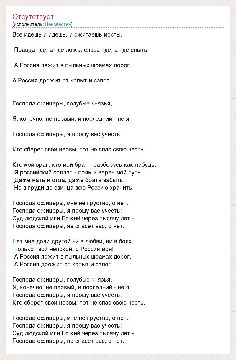 Все идешь и идешь, и сжигаешь мосты. Правда где, а где ложь, слава где, а где сныть. А Россия лежит в пыльных шрамах дорог. А Россия дрожит от копыт и сапог. Господа офицеры, голубые князья, Я, конечно, не первый, и последний - не я. Господа офицеры, я прошу вас учесть: Кто сберег свои нервы, тот не спас свою честь. Кто мой враг, кто мой брат - разберусь как-нибудь. Я российский солдат - прям и верен мой путь. Даже мать и отца, даже брата забыть, Но в груди до свинца всю Россию хранить. Господа офицеры, мне не грустно, о нет. Господа офицеры, я прошу вас учесть: Суд людской или Божий через тысячу лет - Господа офицеры, не спасет вас, о нет. Нет мне доли другой ни в любви, ни в боях. Только твой непокой, о Россия моя! А Россия лежит в пыльных шрамах дорог. А Россия дрожит от копыт и сапог. Господа офицеры, голубые князья, Я, конечно, не первый, и последний - не я. Господа офицеры, я прошу вас учесть: Кто сберег свои нервы, тот не спас свою честь. Господа офицеры, мне не грустно, о нет. Господа офицеры, я прошу вас учесть: Суд людской или Божий через тысячу лет - Господа офицеры, не спасет вас, о нет.