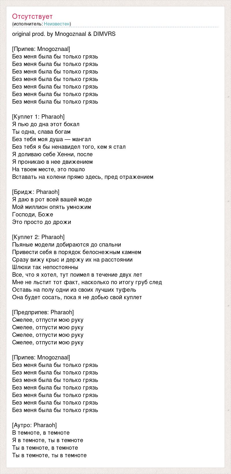 original prod. by Mnogoznaal & DIMVRS [Припев: Mnogoznaal] Без меня была бы только грязь Без меня была бы только грязь Без меня была бы только грязь Без меня была бы только грязь Без меня была бы только грязь Без меня была бы только грязь Без меня была бы только грязь [Куплет 1: Pharaoh] Я пью до дна этот бокал Ты одна, слава богам Без тебя моя душа — мангал Без тебя я бы ненавидел того, кем я стал Я доливаю себе Хенни, после Я проникаю в нее движением На твоем месте, это пошло Вставать на колени прямо здесь, пред отражением [Бридж: Pharaoh] Я даю в рот всей вашей моде Мой миллион опять умножим Господи, Боже Это просто до дрожи [Куплет 2: Pharaoh] Пьяные модели добираются до спальни Привести себя в порядок белоснежным камнем Сразу вижу крыс и держу их на расстоянии Шлюхи так непостоянны Все, что я хотел, тут поимел в течение двух лет Мне не льстит тот факт, насколько по итогу груб след Оставь на полу одни из своих лучших туфель Она будет сосать, пока я не добью свой куплет [Предприпев: Pharaoh] Смелее, отпусти мою руку Смелее, отпусти мою руку Смелее, отпусти мою руку Смелее, отпусти мою руку [Припев: Mnogoznaal] Без меня была бы только грязь Без меня была бы только грязь Без меня была бы только грязь Без меня была бы только грязь Без меня была бы только грязь Без меня была бы только грязь Без меня была бы только грязь [Аутро: Pharaoh] В темноте, в темноте Я в темноте, ты в темноте Ты в темноте, в темноте Ты в темноте, ты в темноте