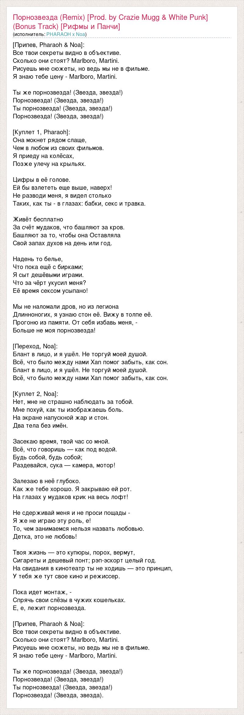 [Припев, Pharaoh & Noa]: Все твои секреты видно в объективе. Сколько они стоят? Marlboro, Martini. Рисуешь мне сюжеты, но ведь мы не в фильме. Я знаю тебе цену - Marlboro, Martini. Ты же порнозвезда! (Звезда, звезда!) Порнозвезда! (Звезда, звезда!) Ты порнозвезда! (Звезда, звезда!) Порнозвезда! (Звезда, звезда!) [Куплет 1, Pharaoh]: Она мокнет рядом слаще, Чем в любом из своих фильмов. Я приеду на колёсах, Позже улечу на крыльях. Цифры в её голове. Ей бы взлететь еще выше, наверх! Не разводи меня, я видел столько Таких, как ты - в глазах: бабки, секс и травка. Живёт бесплатно За счёт мудаков, что башляют за кров. Башляют за то, чтобы она Оставляла Свой запах духов на день или год. Надень то белье, Что пока ещё с бирками; Я сыт дешёвыми играми. Что за чёрт укусил меня? Её время сексом усыпано! Мы не наломали дров, но из легиона Длинноногих, я узнаю стон её. Вижу в толпе её. Прогоню из памяти. От себя избавь меня, - Больше не моя порнозвезда! [Переход, Noa]: Блант в лицо, и я ушёл. Не торгуй моей душой. Всё, что было между нами Xan помог забыть, как сон. Блант в лицо, и я ушёл. Не торгуй моей душой. Всё, что было между нами Xan помог забыть, как сон. [Куплет 2, Noa]: Нет, мне не страшно наблюдать за тобой. Мне похуй, как ты изображаешь боль. На экране напускной жар и стон. Два тела без имён. Засекаю время, твой час со мной. Всё, что говоришь — как под водой. Будь собой, будь собой; Раздевайся, сука — камера, мотор! Залезаю в неё глубоко. Как же тебе хорошо. Я закрываю ей рот. На глазах у мудаков крик на весь лофт! Не сдерживай меня и не проси пощады - Я же не играю эту роль, е! То, чем занимаемся нельзя назвать любовью. Детка, это не любовь! Твоя жизнь — это купюры, порох, вермут, Сигареты и дешевый понт; рэп-эскорт целый год. На свидания в кинотеатр ты не ходишь — это принцип, У тебя же тут свое кино и режиссер. Пока идет монтаж, - Спрячь свои слёзы в чужих кошельках. Е, е, лежит порнозвезда. [Припев, Pharaoh & Noa]: Все твои секреты видно в объективе. Сколько они стоят? Marlboro, Martini. Рисуешь мне сюжеты, но ведь мы не в фильме. Я знаю тебе цену - Marlboro, Martini. Ты же порнозвезда! (Звезда, звезда!) Порнозвезда! (Звезда, звезда!) Ты порнозвезда! (Звезда, звезда!) Порнозвезда! (Звезда, звезда).