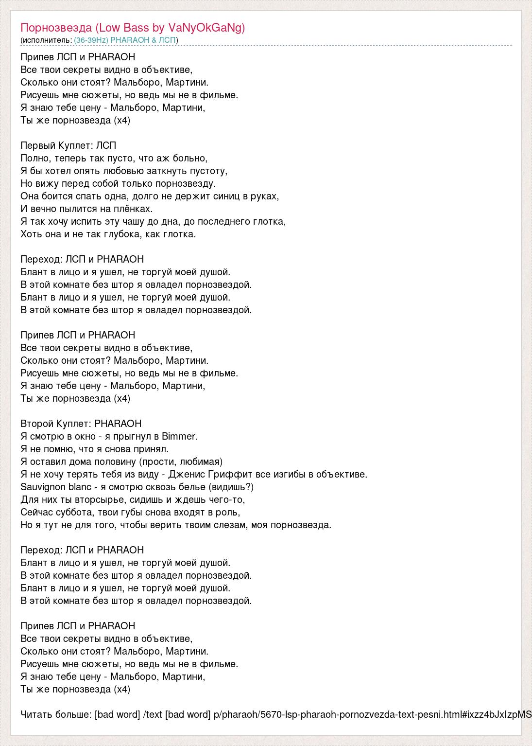 Припев ЛСП и PHARAOH Все твои секреты видно в объективе, Сколько они стоят? Мальборо, Мартини. Рисуешь мне сюжеты, но ведь мы не в фильме. Я знаю тебе цену - Мальборо, Мартини, Ты же порнозвезда (х4) Первый Куплет: ЛСП Полно, теперь так пусто, что аж больно, Я бы хотел опять любовью заткнуть пустоту, Но вижу перед собой только порнозвезду. Она боится спать одна, долго не держит синиц в руках, И вечно пылится на плёнках. Я так хочу испить эту чашу до дна, до последнего глотка, Хоть она и не так глубока, как глотка. Переход: ЛСП и PHARAOH Блант в лицо и я ушел, не торгуй моей душой. В этой комнате без штор я овладел порнозвездой. Блант в лицо и я ушел, не торгуй моей душой. В этой комнате без штор я овладел порнозвездой. Припев ЛСП и PHARAOH Все твои секреты видно в объективе, Сколько они стоят? Мальборо, Мартини. Рисуешь мне сюжеты, но ведь мы не в фильме. Я знаю тебе цену - Мальборо, Мартини, Ты же порнозвезда (х4) Второй Куплет: PHARAOH Я смотрю в окно - я прыгнул в Bimmer. Я не помню, что я снова принял. Я оставил дома половину (прости, любимая) Я не хочу терять тебя из виду - Дженис Гриффит все изгибы в объективе. Sauvignon blanc - я смотрю сквозь белье (видишь?) Для них ты вторсырье, сидишь и ждешь чего-то, Сейчас суббота, твои губы снова входят в роль, Но я тут не для того, чтобы верить твоим слезам, моя порнозвезда. Переход: ЛСП и PHARAOH Блант в лицо и я ушел, не торгуй моей душой. В этой комнате без штор я овладел порнозвездой. Блант в лицо и я ушел, не торгуй моей душой. В этой комнате без штор я овладел порнозвездой. Припев ЛСП и PHARAOH Все твои секреты видно в объективе, Сколько они стоят? Мальборо, Мартини. Рисуешь мне сюжеты, но ведь мы не в фильме. Я знаю тебе цену - Мальборо, Мартини, Ты же порнозвезда (х4) Читать больше: [bad word] /text [bad word] p/pharaoh/5670-lsp-pharaoh-pornozvezda-text-pesni.html#ixzz4bJxIzpMS