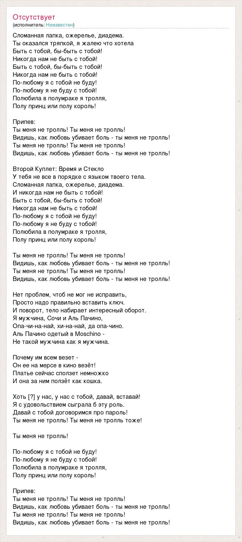 Сломанная лапка, ожерелье, диадема. Ты оказался тряпкой, я жалею что хотела Быть с тобой, бы-быть с тобой! Никогда нам не быть с тобой! Быть с тобой, бы-быть с тобой! Никогда нам не быть с тобой! По-любому я с тобой не буду! По-любому я не буду с тобой! Полюбила в полумраке я тролля, Полу принц или полу король! Припев: Ты меня не тролль! Ты меня не тролль! Видишь, как любовь убивает боль - ты меня не тролль! Ты меня не тролль! Ты меня не тролль! Видишь, как любовь убивает боль - ты меня не тролль! Второй Куплет: Время и Стекло У тебя не все в порядке с языком твоего тела. Сломанная лапка, ожерелье, диадема. И никогда нам не быть с тобой! Быть с тобой, бы-быть с тобой! Никогда нам не быть с тобой! По-любому я с тобой не буду! По-любому я не буду с тобой! Полюбила в полумраке я тролля, Полу принц или полу король! Ты меня не тролль! Ты меня не тролль! Видишь, как любовь убивает боль - ты меня не тролль! Ты меня не тролль! Ты меня не тролль! Видишь, как любовь убивает боль - ты меня не тролль! Нет проблем, чтоб не мог не исправить, Просто надо правильно вставить ключ. И поворот, тело набирает интересный оборот. Я мужчина, Сочи и Аль Пачино, Опа-чи-на-най, xи-на-най, да опа-чино. Аль Пачино одетый в Moschino - Не такой мужчина как я мужчина. Почему им всем везет - Он ее на мерсе в кино везёт! Платье сейчас сползет немножко И она за ним ползёт как кошка. Хоть [?] у нас, у нас с тобой, давай, вставай! Я с удовольствием сыграла б эту роль. Давай с тобой договоримся про пароль! Ты меня не тролль! Ты меня не тролль тоже! Ты меня не тролль! По-любому я с тобой не буду! По-любому я не буду с тобой! Полюбила в полумраке я тролля, Полу принц или полу король! Припев: Ты меня не тролль! Ты меня не тролль! Видишь, как любовь убивает боль - ты меня не тролль! Ты меня не тролль! Ты меня не тролль! Видишь, как любовь убивает боль - ты меня не тролль!