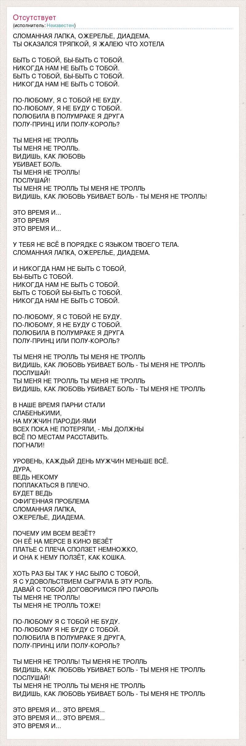 СЛОМАННАЯ ЛАПКА, ОЖЕРЕЛЬЕ, ДИАДЕМА. ТЫ ОКАЗАЛСЯ ТРЯПКОЙ, Я ЖАЛЕЮ ЧТО ХОТЕЛА БЫТЬ С ТОБОЙ, БЫ-БЫТЬ С ТОБОЙ. НИКОГДА НАМ НЕ БЫТЬ С ТОБОЙ. БЫТЬ С ТОБОЙ, БЫ-БЫТЬ С ТОБОЙ. НИКОГДА НАМ НЕ БЫТЬ С ТОБОЙ. ПО-ЛЮБОМУ, Я С ТОБОЙ НЕ БУДУ. ПО-ЛЮБОМУ, Я НЕ БУДУ С ТОБОЙ. ПОЛЮБИЛА В ПОЛУМРАКЕ Я ДРУГА ПОЛУ-ПРИНЦ ИЛИ ПОЛУ-КОРОЛЬ? ТЫ МЕНЯ НЕ ТРОЛЛЬ ТЫ МЕНЯ НЕ ТРОЛЛЬ. ВИДИШЬ, КАК ЛЮБОВЬ УБИВАЕТ БОЛЬ. ТЫ МЕНЯ НЕ ТРОЛЛЬ! ПОСЛУШАЙ! ТЫ МЕНЯ НЕ ТРОЛЛЬ ТЫ МЕНЯ НЕ ТРОЛЛЬ ВИДИШЬ, КАК ЛЮБОВЬ УБИВАЕТ БОЛЬ - ТЫ МЕНЯ НЕ ТРОЛЛЬ! ЭТО ВРЕМЯ И... ЭТО ВРЕМЯ ЭТО ВРЕМЯ И... У ТЕБЯ НЕ ВСЁ В ПОРЯДКЕ С ЯЗЫКОМ ТВОЕГО ТЕЛА. СЛОМАННАЯ ЛАПКА, ОЖЕРЕЛЬЕ, ДИАДЕМА. И НИКОГДА НАМ НЕ БЫТЬ С ТОБОЙ, БЫ-БЫТЬ С ТОБОЙ. НИКОГДА НАМ НЕ БЫТЬ С ТОБОЙ. БЫТЬ С ТОБОЙ БЫ-БЫТЬ С ТОБОЙ. НИКОГДА НАМ НЕ БЫТЬ С ТОБОЙ. ПО-ЛЮБОМУ, Я С ТОБОЙ НЕ БУДУ. ПО-ЛЮБОМУ, Я НЕ БУДУ С ТОБОЙ. ПОЛЮБИЛА В ПОЛУМРАКЕ Я ДРУГА ПОЛУ-ПРИНЦ ИЛИ ПОЛУ-КОРОЛЬ? ТЫ МЕНЯ НЕ ТРОЛЛЬ ТЫ МЕНЯ НЕ ТРОЛЛЬ ВИДИШЬ, КАК ЛЮБОВЬ УБИВАЕТ БОЛЬ - ТЫ МЕНЯ НЕ ТРОЛЛЬ ПОСЛУШАЙ! ТЫ МЕНЯ НЕ ТРОЛЛЬ ТЫ МЕНЯ НЕ ТРОЛЛЬ ВИДИШЬ, КАК ЛЮБОВЬ УБИВАЕТ БОЛЬ - ТЫ МЕНЯ НЕ ТРОЛЛЬ В НАШЕ ВРЕМЯ ПАРНИ СТАЛИ СЛАБЕНЬКИМИ, НА МУЖЧИН ПАРОДИ-ЯМИ ВСЕХ ПОКА НЕ ПОТЕРЯЛИ, - МЫ ДОЛЖНЫ ВСЁ ПО МЕСТАМ РАССТАВИТЬ. ПОГНАЛИ! УРОВЕНЬ, КАЖДЫЙ ДЕНЬ МУЖЧИН МЕНЬШЕ ВСЁ. ДУРА, ВЕДЬ НЕКОМУ ПОПЛАКАТЬСЯ В ПЛЕЧО. БУДЕТ ВЕДЬ ОФИГЕННАЯ ПРОБЛЕМА СЛОМАННАЯ ЛАПКА, ОЖЕРЕЛЬЕ, ДИАДЕМА. ПОЧЕМУ ИМ ВСЕМ ВЕЗЁТ? ОН ЕЁ НА МЕРСЕ В КИНО ВЕЗЁТ ПЛАТЬЕ С ПЛЕЧА СПОЛЗЕТ НЕМНОЖКО, И ОНА К НЕМУ ПОЛЗЁТ, КАК КОШКА. ХОТЬ РАЗ БЫ ТАК У НАС БЫЛО С ТОБОЙ, Я С УДОВОЛЬСТВИЕМ СЫГРАЛА Б ЭТУ РОЛЬ. ДАВАЙ С ТОБОЙ ДОГОВОРИМСЯ ПРО ПАРОЛЬ ТЫ МЕНЯ НЕ ТРОЛЛЬ! ТЫ МЕНЯ НЕ ТРОЛЛЬ ТОЖЕ! ПО-ЛЮБОМУ Я С ТОБОЙ НЕ БУДУ. ПО-ЛЮБОМУ Я НЕ БУДУ С ТОБОЙ. ПОЛЮБИЛА В ПОЛУМРАКЕ Я ДРУГА, ПОЛУ-ПРИНЦ ИЛИ ПОЛУ-КОРОЛЬ? ТЫ МЕНЯ НЕ ТРОЛЛЬ! ТЫ МЕНЯ НЕ ТРОЛЛЬ ВИДИШЬ, КАК ЛЮБОВЬ УБИВАЕТ БОЛЬ - ТЫ МЕНЯ НЕ ТРОЛЛЬ ПОСЛУШАЙ! ТЫ МЕНЯ НЕ ТРОЛЛЬ ТЫ МЕНЯ НЕ ТРОЛЛЬ ВИДИШЬ, КАК ЛЮБОВЬ УБИВАЕТ БОЛЬ - ТЫ МЕНЯ НЕ ТРОЛЛЬ ЭТО ВРЕМЯ И... ЭТО ВРЕМЯ... ЭТО ВРЕМЯ И... ЭТО ВРЕМЯ... ЭТО ВРЕМЯ И...