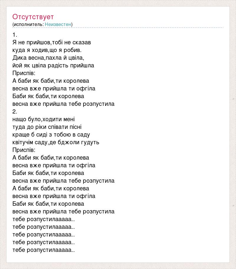 1. Я не прийшов,тобі не сказав куда я ходив,що я робив. Дика весна,пахла й цвіла, йой як цвіла радість прийшла Приспів: А баби як баби,ти королева весна вже прийшла ти офгіла Баби як баби,ти королева весна вже прийшла тебе розпустила 2. нащо було,ходити мені туда до ріки співати пісні краще б сиді з тобою в саду квітучім саду,де бджоли гудуть Приспів: А баби як баби,ти королева весна вже прийшла ти офгіла Баби як баби,ти королева весна вже прийшла тебе розпустила А баби як баби,ти королева весна вже прийшла ти офгіла Баби як баби,ти королева весна вже прийшла тебе розпустила тебе розпустилааааа.. тебе розпустилааааа.. тебе розпустилааааа.. тебе розпустилааааа.. тебе розпустилааааа..