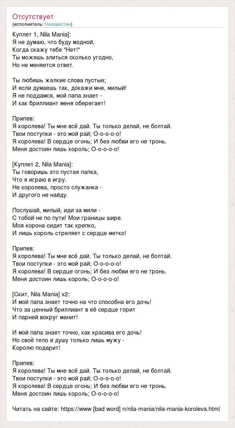 Куплет 1, Nila Mania]: Я не думаю, что буду модной, Когда скажу тебе "Нет!" Ты можешь злиться сколько угодно, Но не меняется ответ. Ты любишь жалкие слова пустые; И если думаешь так, докажи мне, милый! Я не поддамся, мой папа знает - И как бриллиант меня оберегает! Припев: Я королева! Ты мне всё дай. Ты только делай, не болтай. Твои поступки - это мой рай; О-о-о-о-о! Я королева! В сердце огонь; И без любви его не тронь. Меня достоин лишь король; О-о-о-о-о! [Куплет 2, Nila Mania]: Ты говоришь это пустая папка, Что я играю в игру. Не королева, просто служанка - И другого не найду. Послушай, милый, иди за мили - С тобой не по пути! Мои границы шире. Моя корона сидит так крепко, И лишь король стреляет с сердце метко! Припев: Я королева! Ты мне всё дай. Ты только делай, не болтай. Твои поступки - это мой рай; О-о-о-о-о! Я королева! В сердце огонь; И без любви его не тронь. Меня достоин лишь король; О-о-о-о-о! [Скит, Nila Mania] х2: И мой папа знает точно на что способна его дочь! Что за ценный бриллиант в её сердце горит И парней вокруг манит! И мой папа знает точно, как красива его дочь! Но своё тело и душу только лишь мужу - Королю подарит! Припев: Я королева! Ты мне всё дай. Ты только делай, не болтай. Твои поступки - это мой рай; О-о-о-о-о! Я королева! В сердце огонь; И без любви его не тронь. Меня достоин лишь король; О-о-о-о-о! Читать на сайте: https://www [bad word] n/nila-mania/nila-mania-koroleva.html