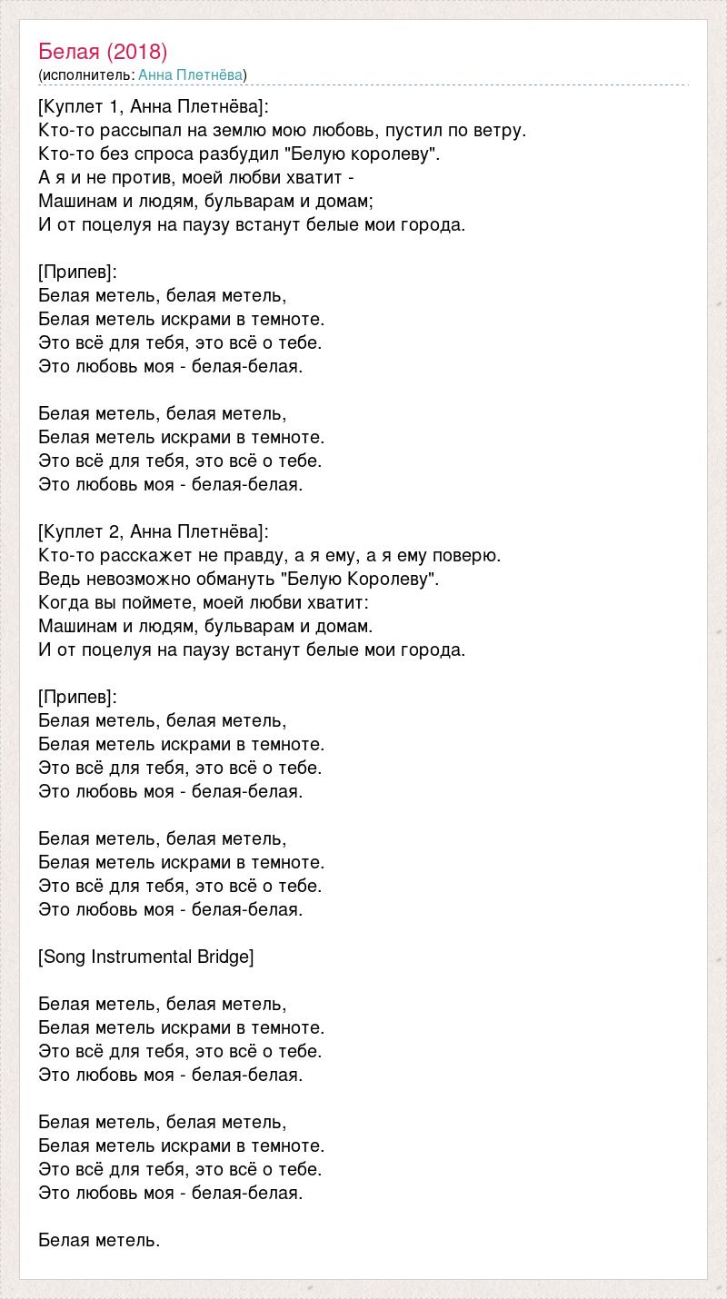 [Куплет 1, Анна Плетнёва]: Кто-то рассыпал на землю мою любовь, пустил по ветру. Кто-то без спроса разбудил "Белую королеву". А я и не против, моей любви хватит - Машинам и людям, бульварам и домам; И от поцелуя на паузу встанут белые мои города. [Припев]: Белая метель, белая метель, Белая метель искрами в темноте. Это всё для тебя, это всё о тебе. Это любовь моя - белая-белая. Белая метель, белая метель, Белая метель искрами в темноте. Это всё для тебя, это всё о тебе. Это любовь моя - белая-белая. [Куплет 2, Анна Плетнёва]: Кто-то расскажет не правду, а я ему, а я ему поверю. Ведь невозможно обмануть "Белую Королеву". Когда вы поймете, моей любви хватит: Машинам и людям, бульварам и домам. И от поцелуя на паузу встанут белые мои города. [Припев]: Белая метель, белая метель, Белая метель искрами в темноте. Это всё для тебя, это всё о тебе. Это любовь моя - белая-белая. Белая метель, белая метель, Белая метель искрами в темноте. Это всё для тебя, это всё о тебе. Это любовь моя - белая-белая. [Song Instrumental Bridge] Белая метель, белая метель, Белая метель искрами в темноте. Это всё для тебя, это всё о тебе. Это любовь моя - белая-белая. Белая метель, белая метель, Белая метель искрами в темноте. Это всё для тебя, это всё о тебе. Это любовь моя - белая-белая. Белая метель.