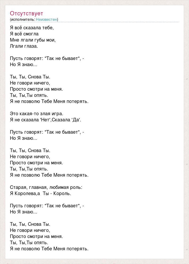 Я всё сказала тебе, Я всё смогла Мне лгали губы мои, Лгали глаза. Пусть говорят: "Так не бывает", - Но Я знаю... Ты, Ты, Снова Ты. Не говори ничего, Просто смотри на меня. Ты, Ты,Ты опять. Я не позволю Тебе Меня потерять. Это какая-то злая игра. Я не сказала 'Нет',Сказала 'Да'. Пусть говорят: "Так не бывает", - Но Я знаю... Ты, Ты, Снова Ты. Не говори ничего, Просто смотри на меня. Ты, Ты,Ты опять. Я не позволю Тебе Меня потерять. Старая, главная, любимая роль: Я Королева,а Ты - Король. Пусть говорят: "Так не бывает", - Но Я знаю... Ты, Ты, Снова Ты. Не говори ничего, Просто смотри на меня. Ты, Ты,Ты опять. Я не позволю Тебе Меня потерять.
