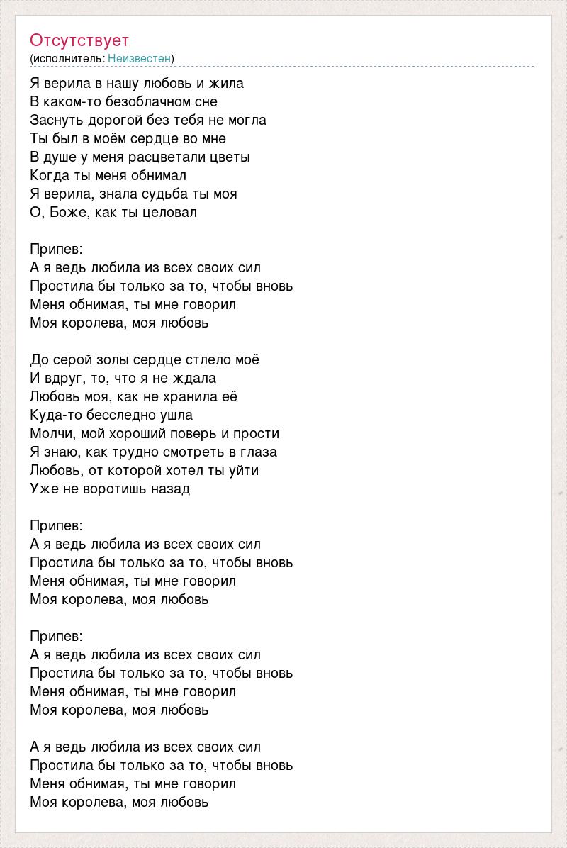 Я верила в нашу любовь и жила В каком-то безоблачном сне Заснуть дорогой без тебя не могла Ты был в моём сердце во мне В душе у меня расцветали цветы Когда ты меня обнимал Я верила, знала судьба ты моя О, Боже, как ты целовал Припев: А я ведь любила из всех своих сил Простила бы только за то, чтобы вновь Меня обнимая, ты мне говорил Моя королева, моя любовь До серой золы сердце стлело моё И вдруг, то, что я не ждала Любовь моя, как не хранила её Куда-то бесследно ушла Молчи, мой хороший поверь и прости Я знаю, как трудно смотреть в глаза Любовь, от которой хотел ты уйти Уже не воротишь назад Припев: А я ведь любила из всех своих сил Простила бы только за то, чтобы вновь Меня обнимая, ты мне говорил Моя королева, моя любовь Припев: А я ведь любила из всех своих сил Простила бы только за то, чтобы вновь Меня обнимая, ты мне говорил Моя королева, моя любовь А я ведь любила из всех своих сил Простила бы только за то, чтобы вновь Меня обнимая, ты мне говорил Моя королева, моя любовь