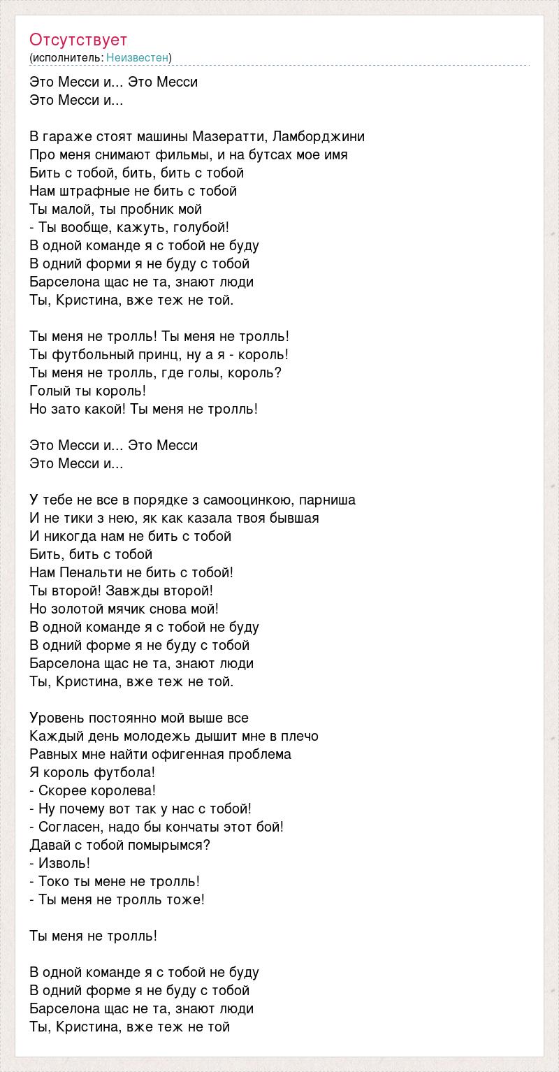 Это Месси и... Это Месси Это Месси и... В гараже стоят машины Мазератти, Ламборджини Про меня снимают фильмы, и на бутсах мое имя Бить с тобой, бить, бить с тобой Нам штрафные не бить с тобой Ты малой, ты пробник мой - Ты вообще, кажуть, голубой! В одной команде я с тобой не буду В одний форми я не буду с тобой Барселона щас не та, знают люди Ты, Кристина, вже теж не той. Ты меня не тролль! Ты меня не тролль! Ты футбольный принц, ну а я - король! Ты меня не тролль, где голы, король? Голый ты король! Но зато какой! Ты меня не тролль! Это Месси и... Это Месси Это Месси и... У тебе не все в порядке з самооцинкою, парниша И не тики з нею, як как казала твоя бывшая И никогда нам не бить с тобой Бить, бить с тобой Нам Пенальти не бить с тобой! Ты второй! Завжды второй! Но золотой мячик снова мой! В одной команде я с тобой не буду В одний форме я не буду с тобой Барселона щас не та, знают люди Ты, Кристина, вже теж не той. Уровень постоянно мой выше все Каждый день молодежь дышит мне в плечо Равных мне найти офигенная проблема Я король футбола! - Скорее королева! - Ну почему вот так у нас с тобой! - Согласен, надо бы кончаты этот бой! Давай с тобой помырымся? - Изволь! - Токо ты мене не тролль! - Ты меня не тролль тоже! Ты меня не тролль! В одной команде я с тобой не буду В одний форме я не буду с тобой Барселона щас не та, знают люди Ты, Кристина, вже теж не той