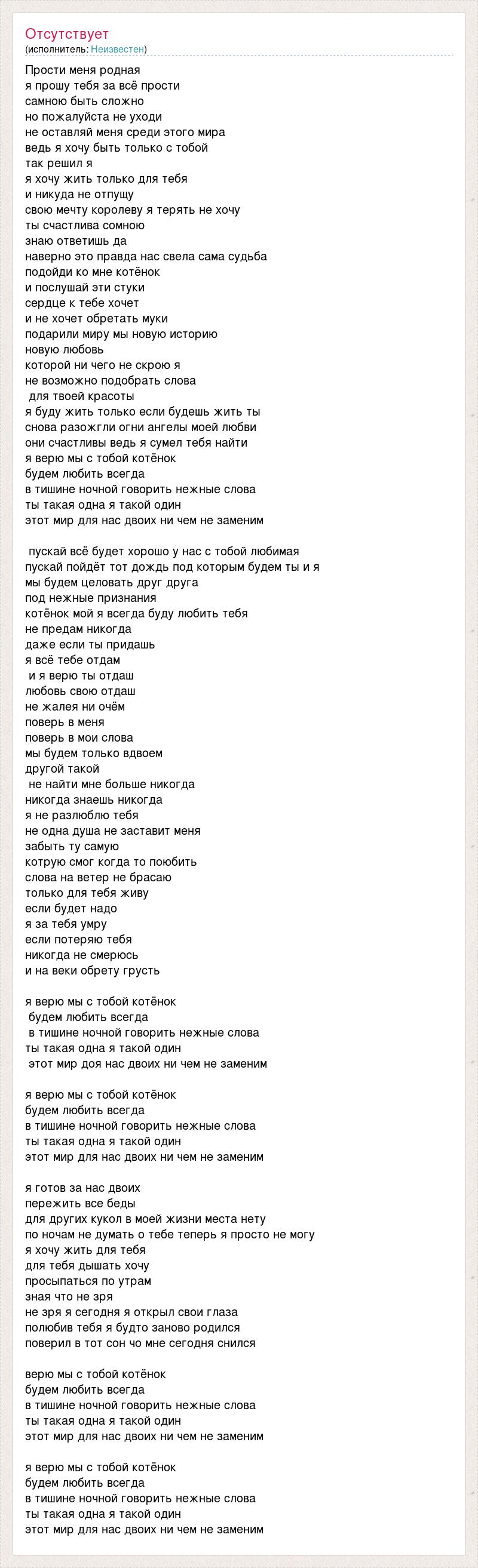 Прости меня родная я прошу тебя за всё прости самною быть сложно но пожалуйста не уходи не оставляй меня среди этого мира ведь я хочу быть только с тобой так решил я я хочу жить только для тебя и никуда не отпущу свою мечту королеву я терять не хочу ты счастлива сомною знаю ответишь да наверно это правда нас свела сама судьба подойди ко мне котёнок и послушай эти стуки сердце к тебе хочет и не хочет обретать муки подарили миру мы новую историю новую любовь которой ни чего не скрою я не возможно подобрать слова для твоей красоты я буду жить только если будешь жить ты снова разожгли огни ангелы моей любви они счастливы ведь я сумел тебя найти я верю мы с тобой котёнок будем любить всегда в тишине ночной говорить нежные слова ты такая одна я такой один этот мир для нас двоих ни чем не заменим пускай всё будет хорошо у нас с тобой любимая пускай пойдёт тот дождь под которым будем ты и я мы будем целовать друг друга под нежные признания котёнок мой я всегда буду любить тебя не предам никогда даже если ты придашь я всё тебе отдам и я верю ты отдаш любовь свою отдаш не жалея ни очём поверь в меня поверь в мои слова мы будем только вдвоем другой такой не найти мне больше никогда никогда знаешь никогда я не разлюблю тебя не одна душа не заставит меня забыть ту самую котрую смог когда то поюбить слова на ветер не брасаю только для тебя живу если будет надо я за тебя умру если потеряю тебя никогда не смерюсь и на веки обрету грусть я верю мы с тобой котёнок будем любить всегда в тишине ночной говорить нежные слова ты такая одна я такой один этот мир доя нас двоих ни чем не заменим я верю мы с тобой котёнок будем любить всегда в тишине ночной говорить нежные слова ты такая одна я такой один этот мир для нас двоих ни чем не заменим я готов за нас двоих пережить все беды для других кукол в моей жизни места нету по ночам не думать о тебе теперь я просто не могу я хочу жить для тебя для тебя дышать хочу просыпаться по утрам зная что не зря не зря я сегодня я открыл свои глаза полюбив тебя я будто заново родился поверил в тот сон чо мне сегодня снился верю мы с тобой котёнок будем любить всегда в тишине ночной говорить нежные слова ты такая одна я такой один этот мир для нас двоих ни чем не заменим я верю мы с тобой котёнок будем любить всегда в тишине ночной говорить нежные слова ты такая одна я такой один этот мир для нас двоих ни чем не заменим