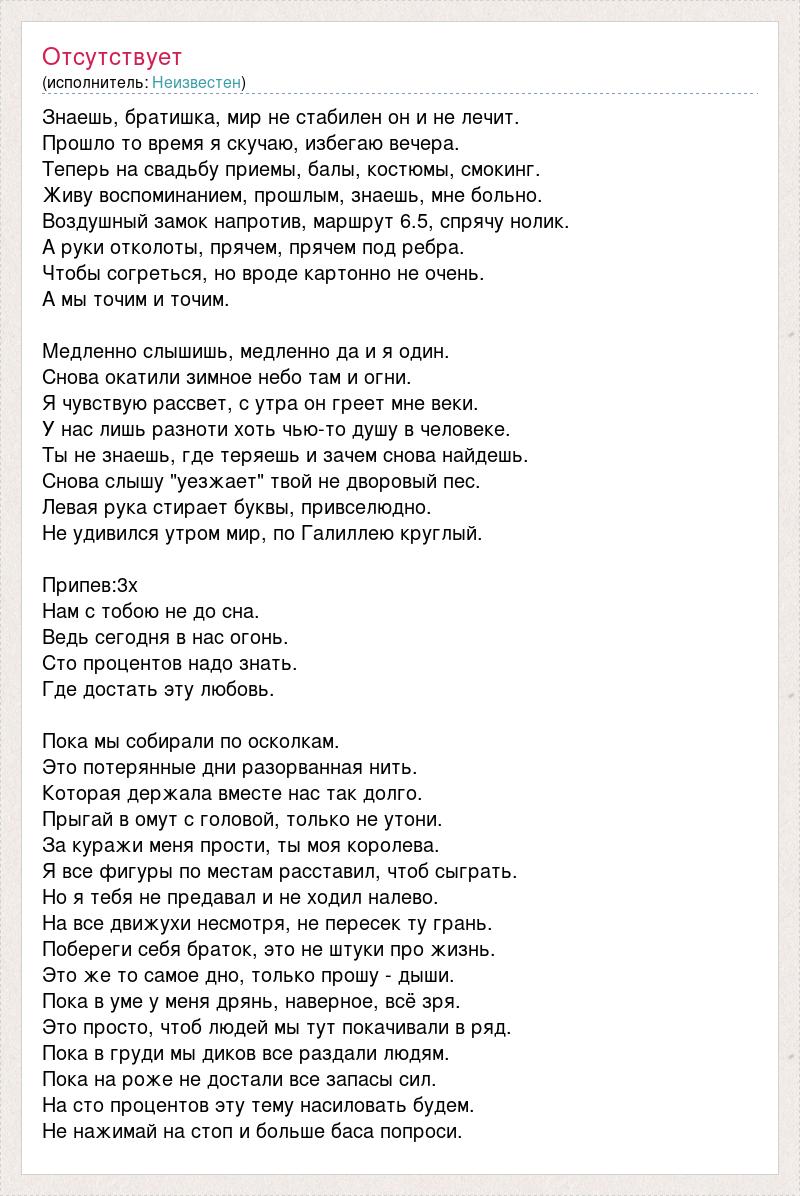 Знаешь, братишка, мир не стабилен он и не лечит. Прошло то время я скучаю, избегаю вечера. Теперь на свадьбу приемы, балы, костюмы, смокинг. Живу воспоминанием, прошлым, знаешь, мне больно. Воздушный замок напротив, маршрут 6.5, спрячу нолик. А руки отколоты, прячем, прячем под ребра. Чтобы согреться, но вроде картонно не очень. А мы точим и точим. Медленно слышишь, медленно да и я один. Снова окатили зимное небо там и огни. Я чувствую рассвет, с утра он греет мне веки. У нас лишь разноти хоть чью-то душу в человеке. Ты не знаешь, где теряешь и зачем снова найдешь. Снова слышу "уезжает" твой не дворовый пес. Левая рука стирает буквы, привселюдно. Не удивился утром мир, по Галиллею круглый. Припев:3х Нам с тобою не до сна. Ведь сегодня в нас огонь. Сто процентов надо знать. Где достать эту любовь. Пока мы собирали по осколкам. Это потерянные дни разорванная нить. Которая держала вместе нас так долго. Прыгай в омут с головой, только не утони. За куражи меня прости, ты моя королева. Я все фигуры по местам расставил, чтоб сыграть. Но я тебя не предавал и не ходил налево. На все движухи несмотря, не пересек ту грань. Побереги себя браток, это не штуки про жизнь. Это же то самое дно, только прошу - дыши. Пока в уме у меня дрянь, наверное, всё зря. Это просто, чтоб людей мы тут покачивали в ряд. Пока в груди мы диков все раздали людям. Пока на роже не достали все запасы сил. На сто процентов эту тему насиловать будем. Не нажимай на стоп и больше баса попроси.