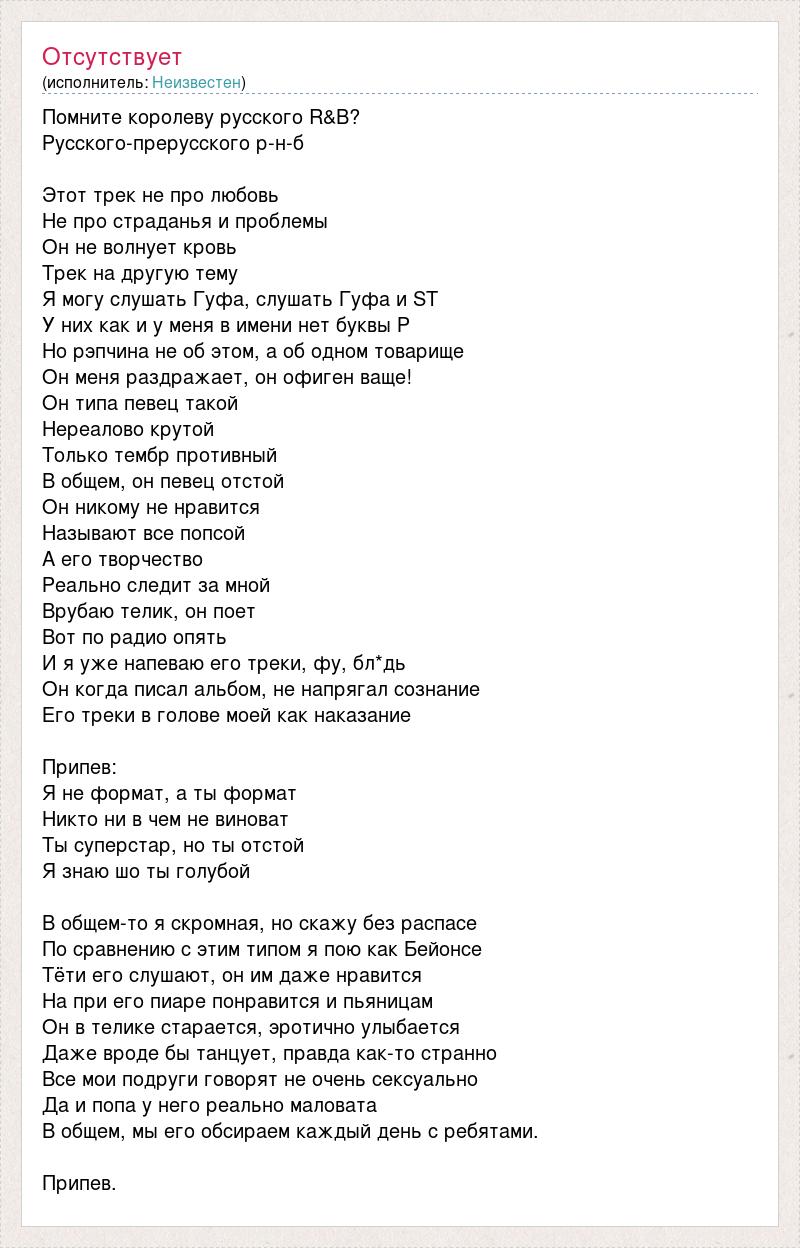 Помните королеву русского R&B? Русского-прерусского р-н-б Этот трек не про любовь Не про страданья и проблемы Он не волнует кровь Трек на другую тему Я могу слушать Гуфа, слушать Гуфа и ST У них как и у меня в имени нет буквы Р Но рэпчина не об этом, а об одном товарище Он меня раздражает, он офиген ваще! Он типа певец такой Нереалово крутой Только тембр противный В общем, он певец отстой Он никому не нравится Называют все попсой А его творчество Реально следит за мной Врубаю телик, он поет Вот по радио опять И я уже напеваю его треки, фу, бл*дь Он когда писал альбом, не напрягал сознание Его треки в голове моей как наказание Припев: Я не формат, а ты формат Никто ни в чем не виноват Ты суперстар, но ты отстой Я знаю шо ты голубой В общем-то я скромная, но скажу без распасе По сравнению с этим типом я пою как Бейонсе Тёти его слушают, он им даже нравится На при его пиаре понравится и пьяницам Он в телике старается, эротично улыбается Даже вроде бы танцует, правда как-то странно Все мои подруги говорят не очень сексуально Да и попа у него реально маловата В общем, мы его обсираем каждый день с ребятами. Припев.