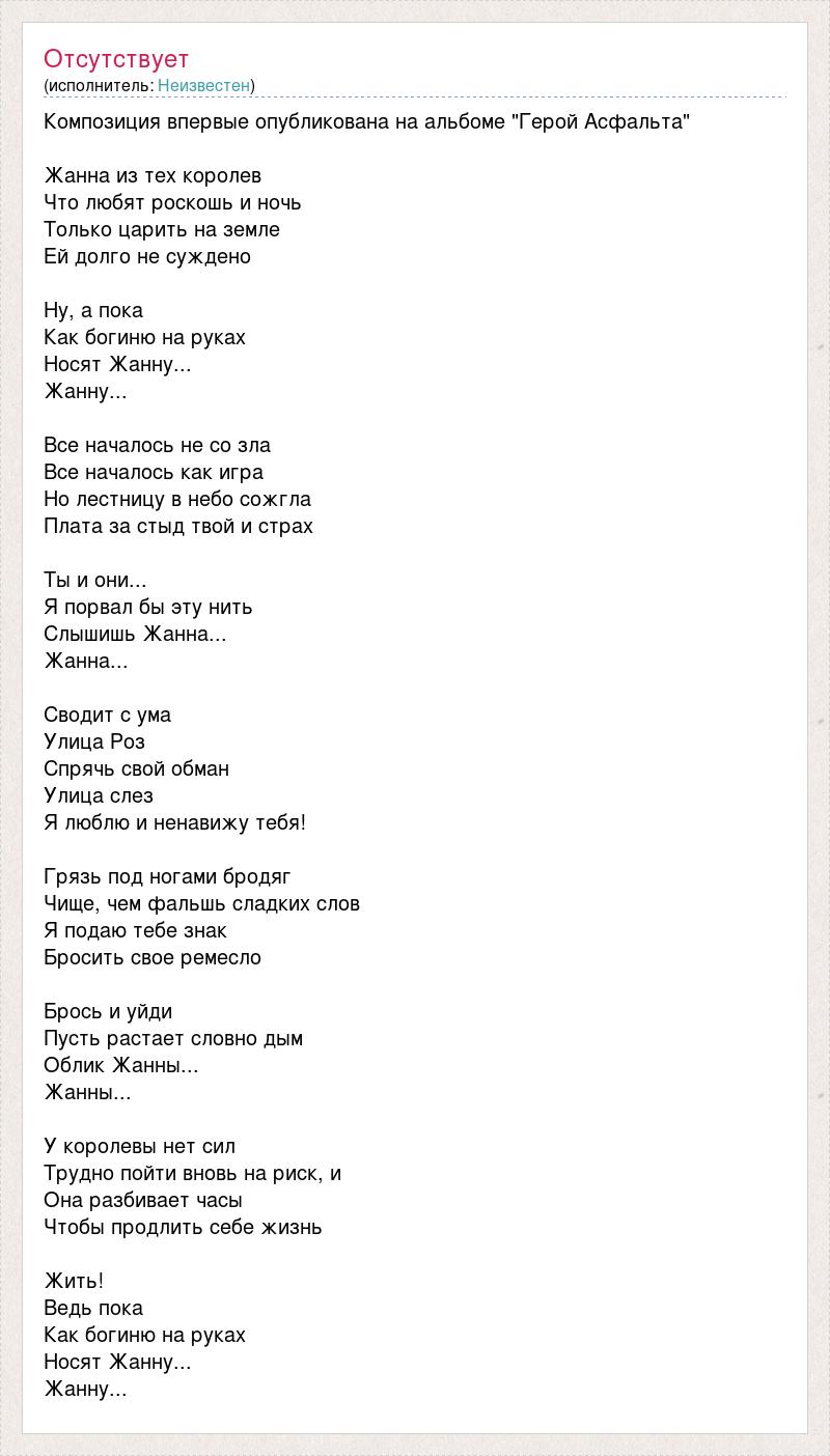 Композиция впервые опубликована на альбоме "Герой Асфальта" Жанна из тех королев Что любят роскошь и ночь Только царить на земле Ей долго не суждено Ну, а пока Как богиню на руках Носят Жанну... Жанну... Все началось не со зла Все началось как игра Но лестницу в небо сожгла Плата за стыд твой и страх Ты и они... Я порвал бы эту нить Слышишь Жанна... Жанна... Сводит с ума Улица Роз Спрячь свой обман Улица слез Я люблю и ненавижу тебя! Грязь под ногами бродяг Чище, чем фальшь сладких слов Я подаю тебе знак Бросить свое ремесло Брось и уйди Пусть растает словно дым Облик Жанны... Жанны... У королевы нет сил Трудно пойти вновь на риск, и Она разбивает часы Чтобы продлить себе жизнь Жить! Ведь пока Как богиню на руках Носят Жанну... Жанну...