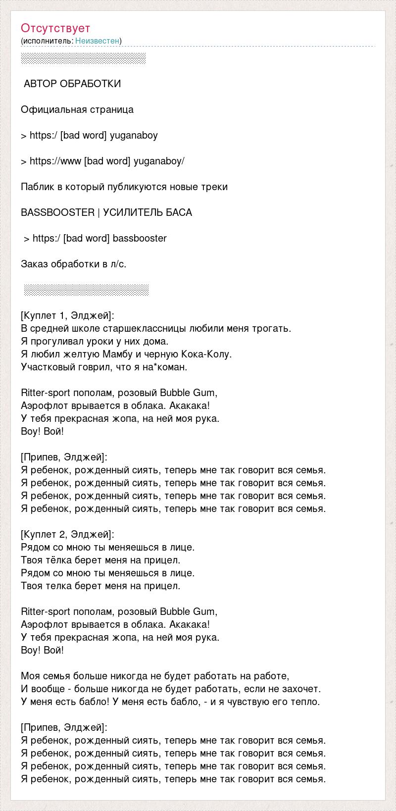 ░░░░░░░░░░░░░░░░░░ АВТОР ОБРАБОТКИ Официальная страница > https:/ [bad word] yuganaboy > https://www [bad word] yuganaboy/ Паблик в который публикуются новые треки BASSBOOSTER | УСИЛИТЕЛЬ БАСА > https:/ [bad word] bassbooster Заказ обработки в л/с. ░░░░░░░░░░░░░░░░░░ [Куплет 1, Элджей]: В средней школе старшеклассницы любили меня трогать. Я прогуливал уроки у них дома. Я любил желтую Мамбу и черную Кока-Колу. Участковый говрил, что я на*коман. Ritter-sport пополам, розовый Bubble Gum, Аэрофлот врывается в облака. Акакака! У тебя прекрасная жопа, на ней моя рука. Воу! Вой! [Припев, Элджей]: Я ребенок, рожденный сиять, теперь мне так говорит вся семья. Я ребенок, рожденный сиять, теперь мне так говорит вся семья. Я ребенок, рожденный сиять, теперь мне так говорит вся семья. Я ребенок, рожденный сиять, теперь мне так говорит вся семья. [Куплет 2, Элджей]: Рядом со мною ты меняешься в лице. Твоя тёлка берет меня на прицел. Рядом со мною ты меняешься в лице. Твоя телка берет меня на прицел. Ritter-sport пополам, розовый Bubble Gum, Аэрофлот врывается в облака. Акакака! У тебя прекрасная жопа, на ней моя рука. Воу! Вой! Моя семья больше никогда не будет работать на работе, И вообще - больше никогда не будет работать, если не захочет. У меня есть бабло! У меня есть бабло, - и я чувствую его тепло. [Припев, Элджей]: Я ребенок, рожденный сиять, теперь мне так говорит вся семья. Я ребенок, рожденный сиять, теперь мне так говорит вся семья. Я ребенок, рожденный сиять, теперь мне так говорит вся семья. Я ребенок, рожденный сиять, теперь мне так говорит вся семья.