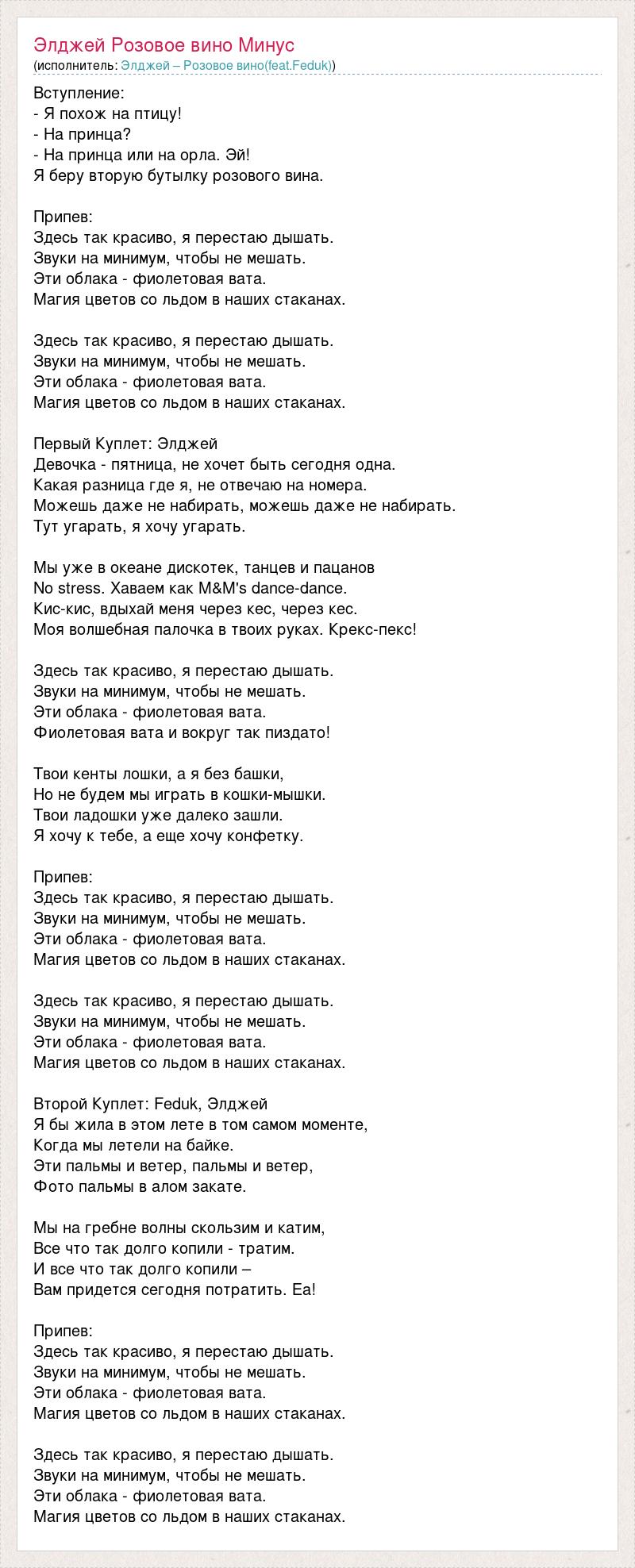 Вступление: - Я похож на птицу! - На принца? - На принца или на орла. Эй! Я беру вторую бутылку розового вина. Припев: Здесь так красиво, я перестаю дышать. Звуки на минимум, чтобы не мешать. Эти облака - фиолетовая вата. Магия цветов со льдом в наших стаканах. Здесь так красиво, я перестаю дышать. Звуки на минимум, чтобы не мешать. Эти облака - фиолетовая вата. Магия цветов со льдом в наших стаканах. Первый Куплет: Элджей Девочка - пятница, не хочет быть сегодня одна. Какая разница где я, не отвечаю на номера. Можешь даже не набирать, можешь даже не набирать. Тут угарать, я хочу угарать. Мы уже в океане дискотек, танцев и пацанов No stress. Хаваем как M&M's dance-dance. Кис-кис, вдыхай меня через кес, через кес. Моя волшебная палочка в твоих руках. Крекс-пекс! Здесь так красиво, я перестаю дышать. Звуки на минимум, чтобы не мешать. Эти облака - фиолетовая вата. Фиолетовая вата и вокруг так пиздато! Твои кенты лошки, а я без башки, Но не будем мы играть в кошки-мышки. Твои ладошки уже далеко зашли. Я хочу к тебе, а еще хочу конфетку. Припев: Здесь так красиво, я перестаю дышать. Звуки на минимум, чтобы не мешать. Эти облака - фиолетовая вата. Магия цветов со льдом в наших стаканах. Здесь так красиво, я перестаю дышать. Звуки на минимум, чтобы не мешать. Эти облака - фиолетовая вата. Магия цветов со льдом в наших стаканах. Второй Куплет: Feduk, Элджей Я бы жила в этом лете в том самом моменте, Когда мы летели на байке. Эти пальмы и ветер, пальмы и ветер, Фото пальмы в алом закате. Мы на гребне волны скользим и катим, Все что так долго копили - тратим. И все что так долго копили – Вам придется сегодня потратить. Еа! Припев: Здесь так красиво, я перестаю дышать. Звуки на минимум, чтобы не мешать. Эти облака - фиолетовая вата. Магия цветов со льдом в наших стаканах. Здесь так красиво, я перестаю дышать. Звуки на минимум, чтобы не мешать. Эти облака - фиолетовая вата. Магия цветов со льдом в наших стаканах.