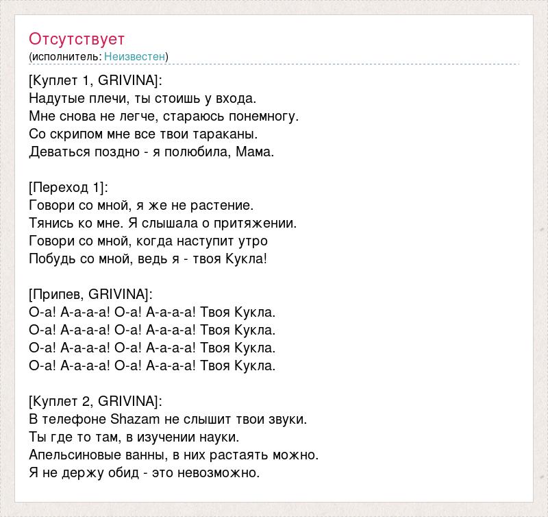 [Куплет 1, GRIVINA]: Надутые плечи, ты стоишь у входа. Мне снова не легче, стараюсь понемногу. Со скрипом мне все твои тараканы. Деваться поздно - я полюбила, Мама. [Переход 1]: Говори со мной, я же не растение. Тянись ко мне. Я слышала о притяжении. Говори со мной, когда наступит утро Побудь со мной, ведь я - твоя Кукла! [Припев, GRIVINA]: О-а! А-а-а-а! О-а! А-а-а-а! Твоя Кукла. О-а! А-а-а-а! О-а! А-а-а-а! Твоя Кукла. О-а! А-а-а-а! О-а! А-а-а-а! Твоя Кукла. О-а! А-а-а-а! О-а! А-а-а-а! Твоя Кукла. [Куплет 2, GRIVINA]: В телефоне Shazam не слышит твои звуки. Ты где то там, в изучении науки. Апельсиновые ванны, в них растаять можно. Я не держу обид - это невозможно.