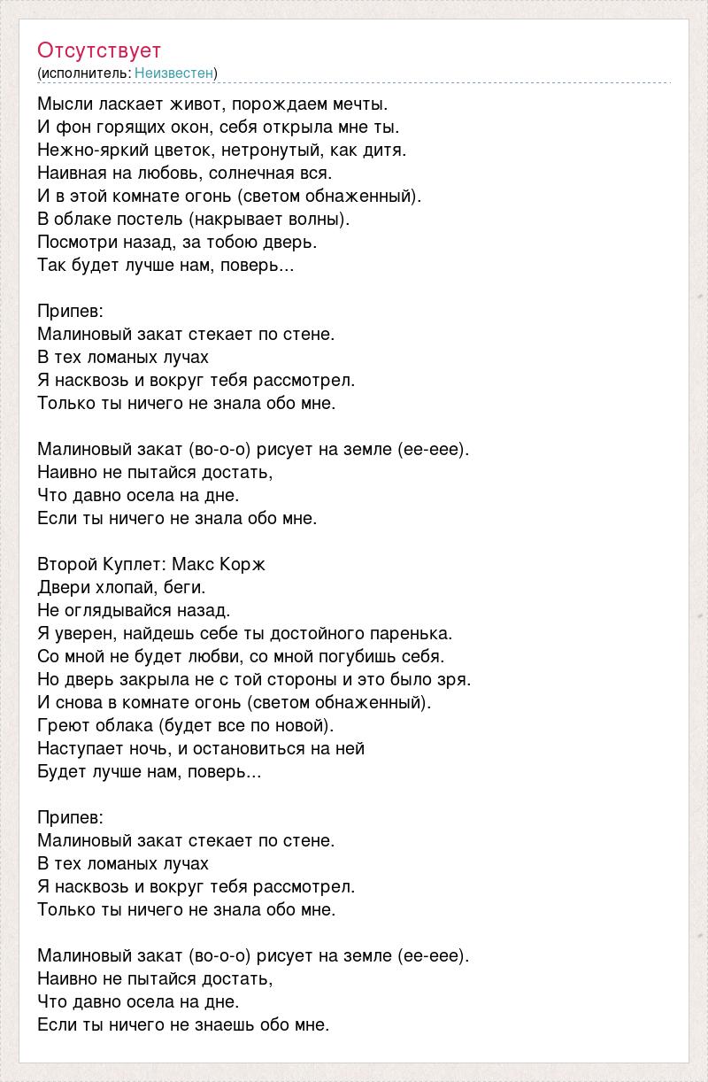 Мысли ласкает живот, порождаем мечты. И фон горящих окон, себя открыла мне ты. Нежно-яркий цветок, нетронутый, как дитя. Наивная на любовь, солнечная вся. И в этой комнате огонь (светом обнаженный). В облаке постель (накрывает волны). Посмотри назад, за тобою дверь. Так будет лучше нам, поверь... Припев: Малиновый закат стекает по стене. В тех ломаных лучах Я насквозь и вокруг тебя рассмотрел. Только ты ничего не знала обо мне. Малиновый закат (во-о-о) рисует на земле (ее-еее). Наивно не пытайся достать, Что давно осела на дне. Если ты ничего не знала обо мне. Второй Куплет: Макс Корж Двери хлопай, беги. Не оглядывайся назад. Я уверен, найдешь себе ты достойного паренька. Со мной не будет любви, со мной погубишь себя. Но дверь закрыла не с той стороны и это было зря. И снова в комнате огонь (светом обнаженный). Греют облака (будет все по новой). Наступает ночь, и остановиться на ней Будет лучше нам, поверь... Припев: Малиновый закат стекает по стене. В тех ломаных лучах Я насквозь и вокруг тебя рассмотрел. Только ты ничего не знала обо мне. Малиновый закат (во-о-о) рисует на земле (ее-еее). Наивно не пытайся достать, Что давно осела на дне. Если ты ничего не знаешь обо мне.