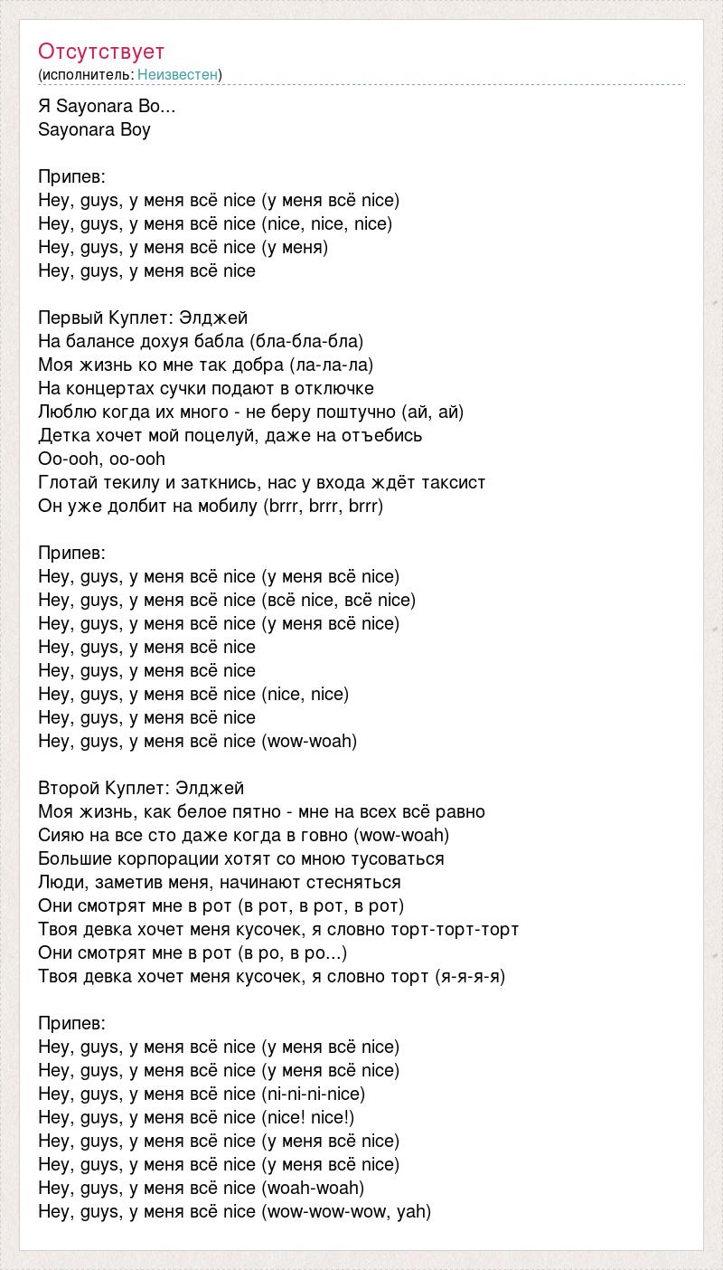 Я Sayonara Bo... Sayonara Boy Припев: Hey, guys, у меня всё nice (у меня всё nice) Hey, guys, у меня всё nice (nice, nice, nice) Hey, guys, у меня всё nice (у меня) Hey, guys, у меня всё nice Первый Куплет: Элджей На балансе дохуя бабла (бла-бла-бла) Моя жизнь ко мне так добра (ла-ла-ла) На концертах сучки подают в отключке Люблю когда их много - не беру поштучно (ай, ай) Детка хочет мой поцелуй, даже на отъебись Oo-ooh, oo-ooh Глотай текилу и заткнись, нас у входа ждёт таксист Он уже долбит на мобилу (brrr, brrr, brrr) Припев: Hey, guys, у меня всё nice (у меня всё nice) Hey, guys, у меня всё nice (всё nice, всё nice) Hey, guys, у меня всё nice (у меня всё nice) Hey, guys, у меня всё nice Hey, guys, у меня всё nice Hey, guys, у меня всё nice (nice, nice) Hey, guys, у меня всё nice Hey, guys, у меня всё nice (wow-woah) Второй Куплет: Элджей Моя жизнь, как белое пятно - мне на всех всё равно Сияю на все сто даже когда в говно (wow-woah) Большие корпорации хотят со мною тусоваться Люди, заметив меня, начинают стесняться Они смотрят мне в рот (в рот, в рот, в рот) Твоя девка хочет меня кусочек, я словно торт-торт-торт Они смотрят мне в рот (в ро, в ро...) Твоя девка хочет меня кусочек, я словно торт (я-я-я-я) Припев: Hey, guys, у меня всё nice (у меня всё nice) Hey, guys, у меня всё nice (у меня всё nice) Hey, guys, у меня всё nice (ni-ni-ni-nice) Hey, guys, у меня всё nice (nice! nice!) Hey, guys, у меня всё nice (у меня всё nice) Hey, guys, у меня всё nice (у меня всё nice) Hey, guys, у меня всё nice (woah-woah) Hey, guys, у меня всё nice (wow-wow-wow, yah)