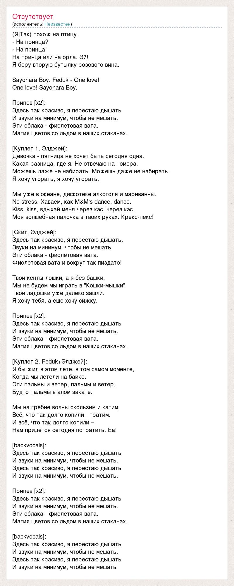(Я|Так) похож на птицу. - На принца? - На принца! На принца или на орла. Эй! Я беру вторую бутылку розового вина. Sayonara Boy. Feduk - One love! One love! Sayonara Boy. Припев [x2]: Здесь так красиво, я перестаю дышать И звуки на минимум, чтобы не мешать. Эти облака - фиолетовая вата. Магия цветов со льдом в наших стаканах. [Куплет 1, Элджей]: Девочка - пятница не хочет быть сегодня одна. Какая разница, где я. Не отвечаю на номера. Можешь даже не набирать. Можешь даже не набирать. Я хочу угорать, я хочу угорать. Мы уже в океане, дискотеке алкоголя и мариванны. No stress. Хаваем, как M&M's dance, dance. Kiss, kiss, вдыхай меня через кэс, через кэс. Моя волшебная палочка в твоих руках. Крекс-пекс! [Скит, Элджей]: Здесь так красиво, я перестаю дышать. Звуки на минимум, чтобы не мешать. Эти облака - фиолетовая вата. Фиолетовая вата и вокруг так пиздато! Твои кенты-лошки, а я без башки, Мы не будем мы играть в "Кошки-мышки". Твои ладошки уже далеко зашли. Я хочу тебя, а еще хочу сижку. Припев [x2]: Здесь так красиво, я перестаю дышать И звуки на минимум, чтобы не мешать. Эти облака - фиолетовая вата. Магия цветов со льдом в наших стаканах. [Куплет 2, Feduk+Элджей]: Я бы жил в этом лете, в том самом моменте, Когда мы летели на байке. Эти пальмы и ветер, пальмы и ветер, Будто пальмы в алом закате. Мы на гребне волны скользим и катим, Всё, что так долго копили - тратим. И всё, что так долго копили – Нам придётся сегодня потратить. Еа! [backvocals]: Здесь так красиво, я перестаю дышать И звуки на минимум, чтобы не мешать. Здесь так красиво, я перестаю дышать И звуки на минимум, чтобы не мешать. Припев [x2]: Здесь так красиво, я перестаю дышать И звуки на минимум, чтобы не мешать. Эти облака - фиолетовая вата. Магия цветов со льдом в наших стаканах. [backvocals]: Здесь так красиво, я перестаю дышать И звуки на минимум, чтобы не мешать. Здесь так красиво, я перестаю дышать И звуки на минимум, чтобы не мешать