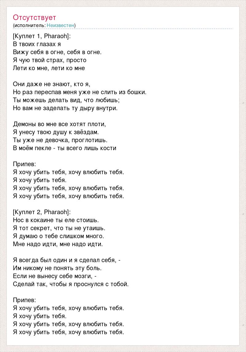 [Куплет 1, Pharaoh]: В твоих глазах я Вижу себя в огне, себя в огне. Я чую твой страх, просто Лети ко мне, лети ко мне Они даже не знают, кто я, Но раз переспав меня уже не слить из бошки. Ты можешь делать вид, что любишь; Но вам не заделать ту дыру внутри. Демоны во мне все хотят плоти, Я унесу твою душу к звёздам. Ты уже не девочка, проглотишь. В моём пекле - ты всего лишь кости Припев: Я хочу убить тебя, хочу влюбить тебя. Я хочу убить тебя. Я хочу убить тебя, хочу влюбить тебя. Я хочу убить тебя, хочу влюбить тебя. [Куплет 2, Pharaoh]: Нос в кокаине ты еле стоишь. Я тот секрет, что ты не утаишь. Я думаю о тебе слишком много. Мне надо идти, мне надо идти. Я всегда был один и я сделал себя, - Им никому не понять эту боль. Если не вынесу себе мозги, - Сделай так, чтобы я проснулся с тобой. Припев: Я хочу убить тебя, хочу влюбить тебя. Я хочу убить тебя. Я хочу убить тебя, хочу влюбить тебя. Я хочу убить тебя, хочу влюбить тебя.