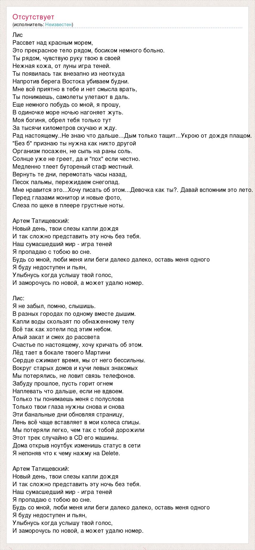Лис Рассвет над красным морем, Это прекрасное тело рядом, босиком немного больно. Ты рядом, чувствую руку твою в своей Нежная кожа, от луны игра теней. Ты появилась так внезапно из неоткуда Напротив берега Востока убиваем будни. Мне всё приятно в тебе и нет смысла врать, Ты понимаешь, самолеты улетают в даль. Еще немного побудь со мной, я прошу, В одиночке море ночью нагоняет жуть. Моя богиня, обрел тебя только тут За тысячи километров скучаю и жду. Рад настоящему..Не знаю что дальше...Дым только тащит...Укрою от дождя плащом. "Без б" признаю ты нужна как никто другой Организм посажен, не сыпь на раны соль. Солнце уже не греет, да и "пох" если честно. Медленно тлеет бутореный стаф местный. Вернуть те дни, перемотать часы назад, Песок пальмы, пережидаем снегопад. Мне нравится это...Хочу писать об этом...Девочка как ты?. Давай вспомним это лето. Перед глазами монитор и новые фото, Слеза по щеке в плеере грустные ноты. Артем Татищевский: Новый день, твои слезы капли дождя И так сложно представить эту ночь без тебя. Наш сумасшедший мир - игра теней Я пропадаю с тобою во сне. Будь со мной, люби меня или беги далеко далеко, оставь меня одного Я буду недоступен и пьян, Улыбнусь когда услышу твой голос, И заморочусь по новой, а может удалю номер. Лис: Я не забыл, помню, слышишь. В разных городах по одному вместе дышим. Капли воды скользят по обнаженному телу Всё так как хотели под этим небом. Алый закат и смех до рассвета Счастье по настоящему, хочу кричать об этом. Лёд тает в бокале твоего Мартини Сердце сжимает время, мы от него бессильны. Вокруг старых домов и кучи левых знакомых Мы потерялись, не ловит связь телефонов. Забуду прошлое, пусть горит огнем Наплевать что дальше, если не вдвоем. Только ты понимаешь меня с полуслова Только твои глаза нужны снова и снова Эти банальные дни обновляя страницу, Лень всё чаще вставляет в мои колеса спицы. Мы потеряли легко, чем так с тобой дорожили Этот трек случайно в CD его машины. Дома открыв ноутбук изменишь статус в сети Я непоняв что к чему нажму на Delete. Артем Татищевский: Новый день, твои слезы капли дождя И так сложно представить эту ночь без тебя. Наш сумасшедший мир - игра теней Я пропадаю с тобою во сне. Будь со мной, люби меня или беги далеко далеко, оставь меня одного Я буду недоступен и пьян, Улыбнусь когда услышу твой голос, И заморочусь по новой, а может удалю номер.