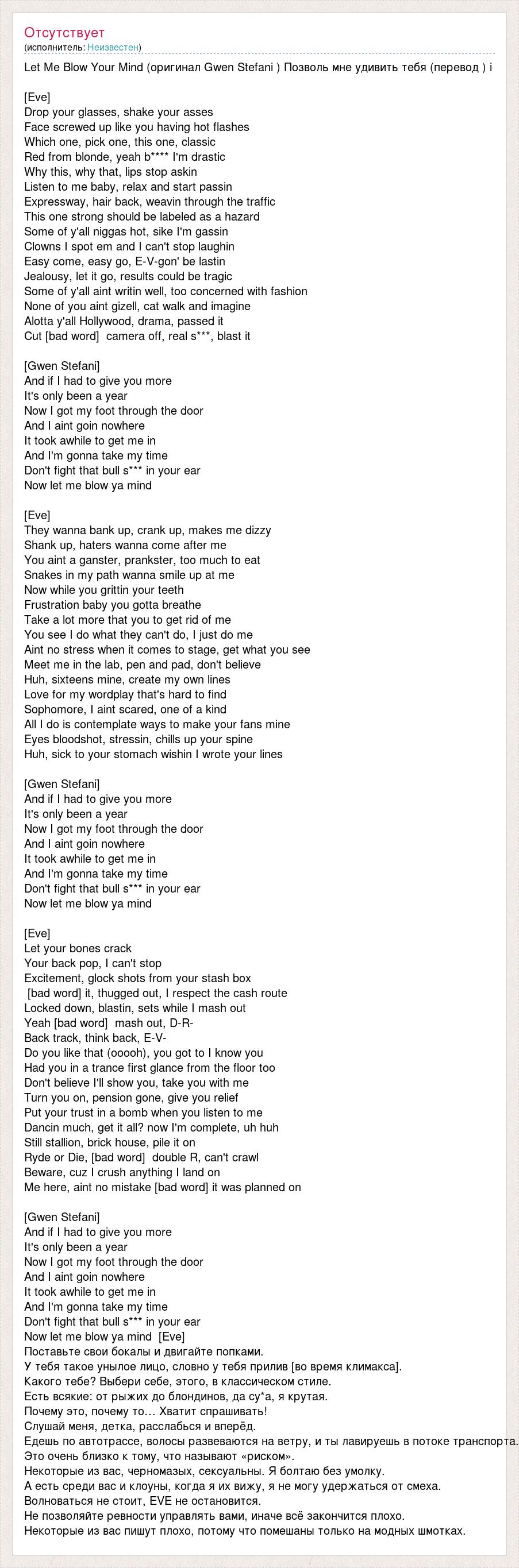 Let Me Blow Your Mind (оригинал Gwen Stefani ) Позволь мне удивить тебя (перевод ) i [Eve] Drop your glasses, shake your asses Face screwed up like you having hot flashes Which one, pick one, this one, classic Red from blonde, yeah b**** I'm drastic Why this, why that, lips stop askin Listen to me baby, relax and start passin Expressway, hair back, weavin through the traffic This one strong should be labeled as a hazard Some of y'all niggas hot, sike I'm gassin Clowns I spot em and I can't stop laughin Easy come, easy go, E-V-gon' be lastin Jealousy, let it go, results could be tragic Some of y'all aint writin well, too concerned with fashion None of you aint gizell, cat walk and imagine Alotta y'all Hollywood, drama, passed it Cut [bad word] camera off, real s***, blast it [Gwen Stefani] And if I had to give you more It's only been a year Now I got my foot through the door And I aint goin nowhere It took awhile to get me in And I'm gonna take my time Don't fight that bull s*** in your ear Now let me blow ya mind [Eve] They wanna bank up, crank up, makes me dizzy Shank up, haters wanna come after me You aint a ganster, prankster, too much to eat Snakes in my path wanna smile up at me Now while you grittin your teeth Frustration baby you gotta breathe Take a lot more that you to get rid of me You see I do what they can't do, I just do me Aint no stress when it comes to stage, get what you see Meet me in the lab, pen and pad, don't believe Huh, sixteens mine, create my own lines Love for my wordplay that's hard to find Sophomore, I aint scared, one of a kind All I do is contemplate ways to make your fans mine Eyes bloodshot, stressin, chills up your spine Huh, sick to your stomach wishin I wrote your lines [Gwen Stefani] And if I had to give you more It's only been a year Now I got my foot through the door And I aint goin nowhere It took awhile to get me in And I'm gonna take my time Don't fight that bull s*** in your ear Now let me blow ya mind [Eve] Let your bones crack Your back pop, I can't stop Excitement, glock shots from your stash box [bad word] it, thugged out, I respect the cash route Locked down, blastin, sets while I mash out Yeah [bad word] mash out, D-R- Back track, think back, E-V- Do you like that (ooooh), you got to I know you Had you in a trance first glance from the floor too Don't believe I'll show you, take you with me Turn you on, pension gone, give you relief Put your trust in a bomb when you listen to me Dancin much, get it all? now I'm complete, uh huh Still stallion, brick house, pile it on Ryde or Die, [bad word] double R, can't crawl Beware, cuz I crush anything I land on Me here, aint no mistake [bad word] it was planned on [Gwen Stefani] And if I had to give you more It's only been a year Now I got my foot through the door And I aint goin nowhere It took awhile to get me in And I'm gonna take my time Don't fight that bull s*** in your ear Now let me blow ya mind [Eve] Поставьте свои бокалы и двигайте попками. У тебя такое унылое лицо, словно у тебя прилив [во время климакса]. Какого тебе? Выбери себе, этого, в классическом стиле. Есть всякие: от рыжих до блондинов, да су*а, я крутая. Почему это, почему то… Хватит спрашивать! Слушай меня, детка, расслабься и вперёд. Едешь по автотрассе, волосы развеваются на ветру, и ты лавируешь в потоке транспорта. Это очень близко к тому, что называют «риском». Некоторые из вас, черномазых, сексуальны. Я болтаю без умолку. А есть среди вас и клоуны, когда я их вижу, я не могу удержаться от смеха. Волноваться не стоит, EVE не остановится. Не позволяйте ревности управлять вами, иначе всё закончится плохо. Некоторые из вас пишут плохо, потому что помешаны только на модных шмотках.