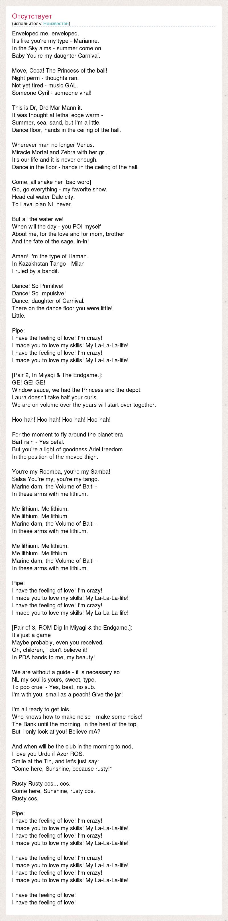 Enveloped me, enveloped. It's like you're my type - Marianne. In the Sky alms - summer come on. Baby You're my daughter Carnival. Move, Coca! The Princess of the ball! Night perm - thoughts ran. Not yet tired - music GAL. Someone Cyril - someone viral! This is Dr, Dre Mar Mann it. It was thought at lethal edge warm - Summer, sea, sand, but I'm a little. Dance floor, hands in the ceiling of the hall. Wherever man no longer Venus. Miracle Mortal and Zebra with her gr. It's our life and it is never enough. Dance in the floor - hands in the ceiling of the hall. Come, all shake her [bad word] Go, go everything - my favorite show. Head cal water Dale city. To Laval plan NL never. But all the water we! When will the day - you POI myself About me, for the love and for mom, brother And the fate of the sage, in-in! Aman! I'm the type of Haman. In Kazakhstan Tango - Milan I ruled by a bandit. Dance! So Primitive! Dance! So Impulsive! Dance, daughter of Carnival. There on the dance floor you were little! Little. Pipe: I have the feeling of love! I'm crazy! I made you to love my skills! My La-La-La-life! I have the feeling of love! I'm crazy! I made you to love my skills! My La-La-La-life! [Pair 2, In Miyagi & The Endgame.]: GE! GE! GE! Window sauce, we had the Princess and the depot. Laura doesn't take half your curls. We are on volume over the years will start over together. Hoo-hah! Hoo-hah! Hoo-hah! Hoo-hah! For the moment to fly around the planet era Bart rain - Yes petal. But you're a light of goodness Ariel freedom In the position of the moved thigh. You're my Roomba, you're my Samba! Salsa You're my, you're my tango. Marine dam, the Volume of Balti - In these arms with me lithium. Me lithium. Me lithium. Me lithium. Me lithium. Marine dam, the Volume of Balti - In these arms with me lithium. Me lithium. Me lithium. Me lithium. Me lithium. Marine dam, the Volume of Balti - In these arms with me lithium. Pipe: I have the feeling of love! I'm crazy! I made you to love my skills! My La-La-La-life! I have the feeling of love! I'm crazy! I made you to love my skills! My La-La-La-life! [Pair of 3, ROM Dig In Miyagi & the Endgame.]: It's just a game Maybe probably, even you received. Oh, children, I don't believe it! In PDA hands to me, my beauty! We are without a guide - it is necessary so NL my soul is yours, sweet, type. To pop cruel - Yes, beat, no sub. I'm with you, small as a peach! Give the jar! I'm all ready to get lois. Who knows how to make noise - make some noise! The Bank until the morning, in the heat of the top, But I only look at you! Believe mA? And when will be the club in the morning to nod, I love you Urdu if Azor ROS. Smile at the Tin, and let's just say: "Come here, Sunshine, because rusty!" Rusty Rusty cos... cos. Come here, Sunshine, rusty cos. Rusty cos. Pipe: I have the feeling of love! I'm crazy! I made you to love my skills! My La-La-La-life! I have the feeling of love! I'm crazy! I made you to love my skills! My La-La-La-life! I have the feeling of love! I'm crazy! I made you to love my skills! My La-La-La-life! I have the feeling of love! I'm crazy! I made you to love my skills! My La-La-La-life! I have the feeling of love! I have the feeling of love!