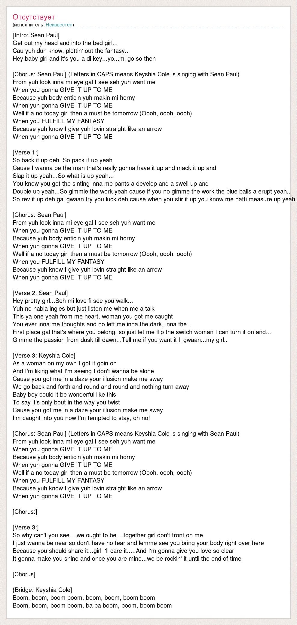 [Chorus: Sean Paul] (Letters in CAPS means Keyshia Cole is singing with Sean Paul)