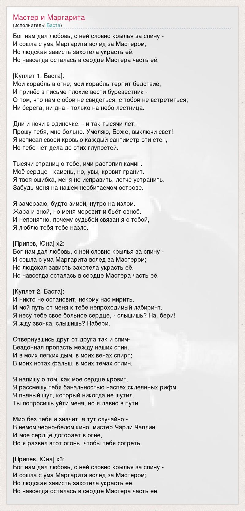 Бог нам дал любовь, с ней словно крылья за спину - И сошла с ума Маргарита вслед за Мастером; Но людская зависть захотела украсть её. Но навсегда осталась в сердце Мастера часть её. [Куплет 1, Баста]: Мой корабль в огне, мой корабль терпит бедствие, И принёс в письме плохие вести буревестник - О том, что нам с обой не свидеться, с тобой не встретиться; Ни берега, ни дна - только на небо лестница. Дни и ночи в одиночке, - и так тысячи лет. Прошу тебя, мне больно. Умоляю, Боже, выключи свет! Я исписал своей кровью каждый сантиметр эти стен, Но тебе нет дела до этих глупостей. Тысячи страниц о тебе, ими растопил камин. Моё сердце - камень, но, увы, кровит гранит. Я твоя ошибка, меня не исправить, легче устранить. Забудь меня на нашем необитаемом острове. Я замерзаю, будто зимой, нутро на излом. Жара и зной, но меня морозит и бьёт озноб. И непонятно, почему судьбой связан я с тобой, Я люблю тебя тебе назло. [Припев, Юна] x2: Бог нам дал любовь, с ней словно крылья за спину - И сошла с ума Маргарита вслед за Мастером; Но людская зависть захотела украсть её. Но навсегда осталась в сердце Мастера часть её. [Куплет 2, Баста]: И никто не остановит, некому нас мирить. И мой путь от меня к тебе непроходимый лабиринт. Я несу тебе свое больное сердце, - слышишь? На, бери! Я жду звонка, слышишь? Набери. Отвернувшись друг от друга так и спим- Бездонная пропасть между наших спин. И в моих легких дым, в моих венах спирт; В моих нотах фальш, в моих темах сплин. Я напишу о том, как мое сердце кровит. Я рассмешу тебя банальностью наспех склеянных рифм. Я пьяный шут, который никогда не шутил. Ты попросишь уйти меня, но я давно в пути. Мир без тебя и значит, я тут случайно - В немом чёрно-белом кино, мистер Чарли Чаплин. И мое сердце догорает в огне, Но я развел этот огонь, чтобы тебя согреть. [Припев, Юна] x3: Бог нам дал любовь, с ней словно крылья за спину - И сошла с ума Маргарита вслед за Мастером; Но людская зависть захотела украсть её. Но навсегда осталась в сердце Мастера часть её.