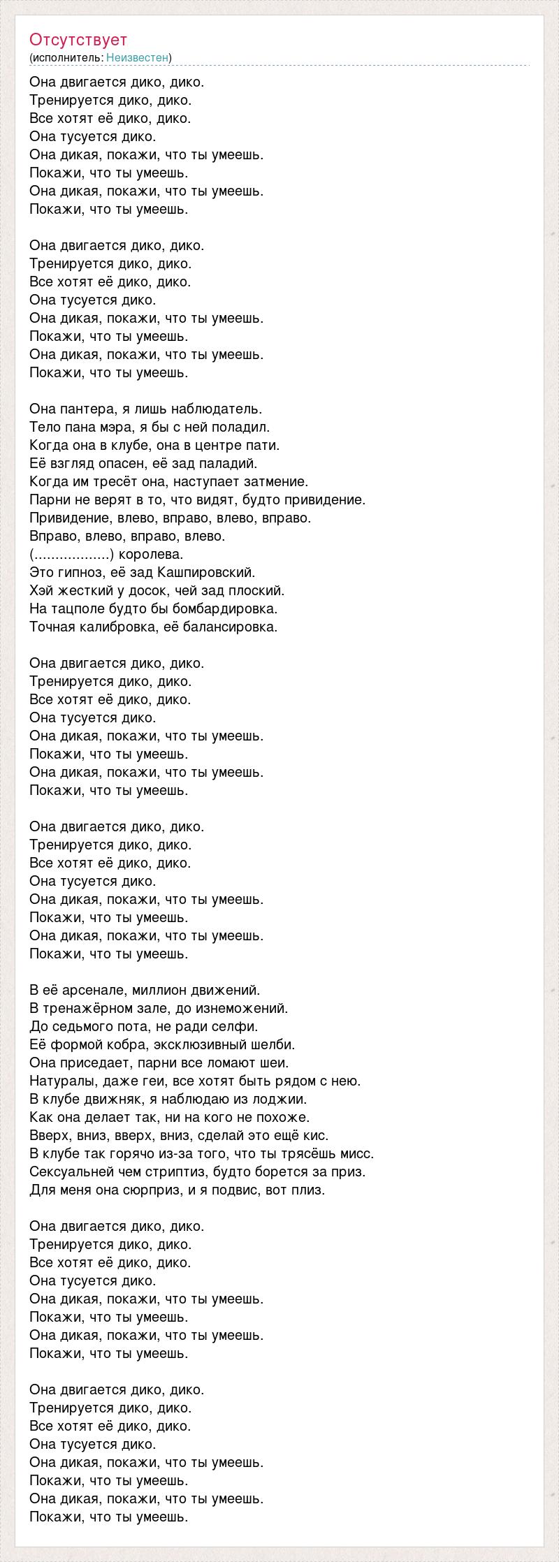 Она двигается дико, дико. Тренируется дико, дико. Все хотят её дико, дико. Она тусуется дико. Она дикая, покажи, что ты умеешь. Покажи, что ты умеешь. Она дикая, покажи, что ты умеешь. Покажи, что ты умеешь. Она двигается дико, дико. Тренируется дико, дико. Все хотят её дико, дико. Она тусуется дико. Она дикая, покажи, что ты умеешь. Покажи, что ты умеешь. Она дикая, покажи, что ты умеешь. Покажи, что ты умеешь. Она пантера, я лишь наблюдатель. Тело пана мэра, я бы с ней поладил. Когда она в клубе, она в центре пати. Её взгляд опасен, её зад паладий. Когда им тресёт она, наступает затмение. Парни не верят в то, что видят, будто привидение. Привидение, влево, вправо, влево, вправо. Вправо, влево, вправо, влево. (..................) королева. Это гипноз, её зад Кашпировский. Хэй жесткий у досок, чей зад плоский. На тацполе будто бы бомбардировка. Точная калибровка, её балансировка. Она двигается дико, дико. Тренируется дико, дико. Все хотят её дико, дико. Она тусуется дико. Она дикая, покажи, что ты умеешь. Покажи, что ты умеешь. Она дикая, покажи, что ты умеешь. Покажи, что ты умеешь. Она двигается дико, дико. Тренируется дико, дико. Все хотят её дико, дико. Она тусуется дико. Она дикая, покажи, что ты умеешь. Покажи, что ты умеешь. Она дикая, покажи, что ты умеешь. Покажи, что ты умеешь. В её арсенале, миллион движений. В тренажёрном зале, до изнеможений. До седьмого пота, не ради селфи. Её формой кобра, эксклюзивный шелби. Она приседает, парни все ломают шеи. Натуралы, даже геи, все хотят быть рядом с нею. В клубе движняк, я наблюдаю из лоджии. Как она делает так, ни на кого не похоже. Вверх, вниз, вверх, вниз, сделай это ещё кис. В клубе так горячо из-за того, что ты трясёшь мисс. Сексуальней чем стриптиз, будто борется за приз. Для меня она сюрприз, и я подвис, вот плиз. Она двигается дико, дико. Тренируется дико, дико. Все хотят её дико, дико. Она тусуется дико. Она дикая, покажи, что ты умеешь. Покажи, что ты умеешь. Она дикая, покажи, что ты умеешь. Покажи, что ты умеешь. Она двигается дико, дико. Тренируется дико, дико. Все хотят её дико, дико. Она тусуется дико. Она дикая, покажи, что ты умеешь. Покажи, что ты умеешь. Она дикая, покажи, что ты умеешь. Покажи, что ты умеешь.