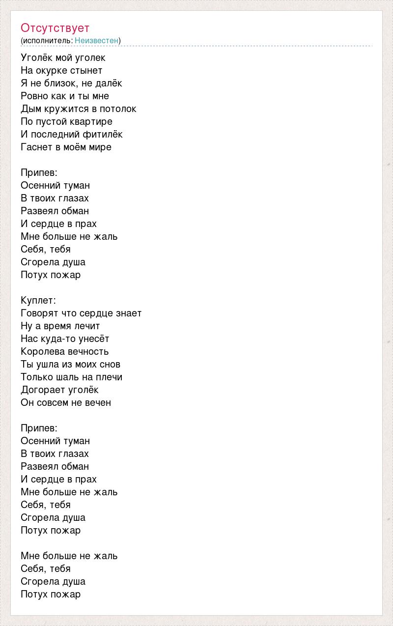 Уголёк мой уголек На окурке стынет Я не близок, не далёк Ровно как и ты мне Дым кружится в потолок По пустой квартире И последний фитилёк Гаснет в моём мире Припев: Осенний туман В твоих глазах Развеял обман И сердце в прах Мне больше не жаль Себя, тебя Сгорела душа Потух пожар Куплет: Говорят что сердце знает Ну а время лечит Нас куда-то унесёт Королева вечность Ты ушла из моих снов Только шаль на плечи Догорает уголёк Он совсем не вечен Припев: Осенний туман В твоих глазах Развеял обман И сердце в прах Мне больше не жаль Себя, тебя Сгорела душа Потух пожар Мне больше не жаль Себя, тебя Сгорела душа Потух пожар