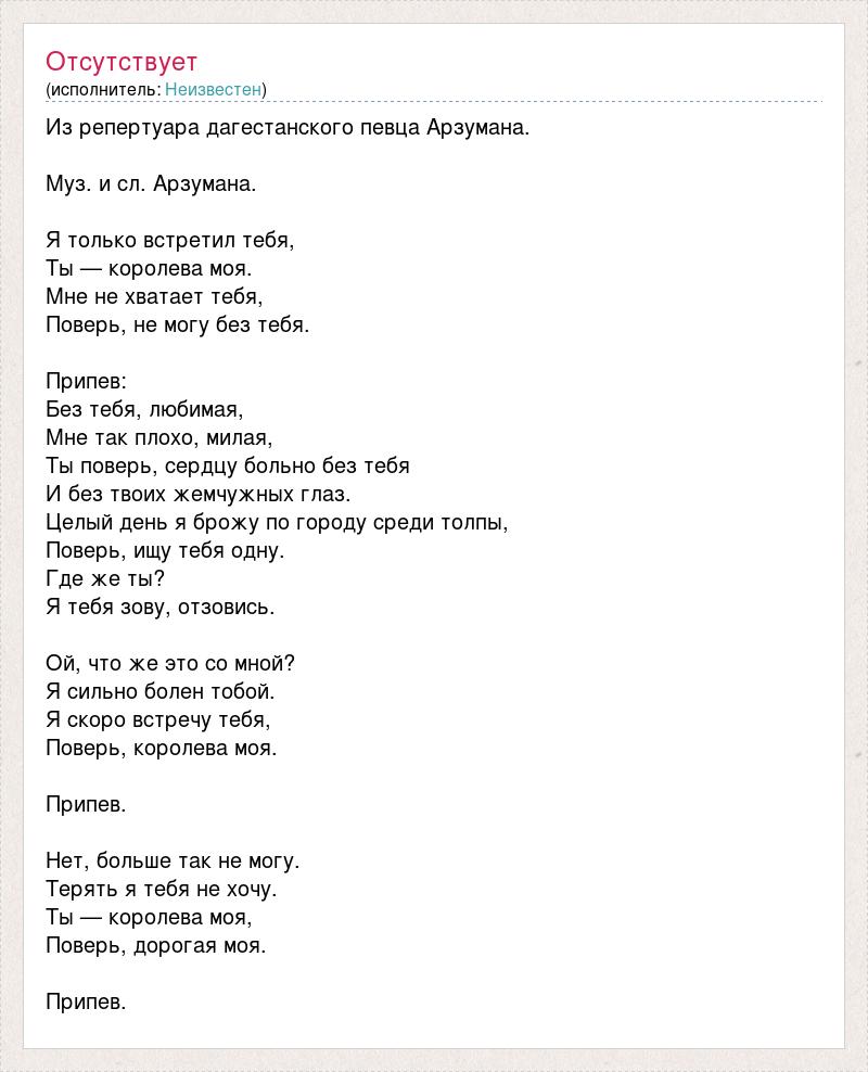 Из репертуара дагестанского певца Арзумана. Муз. и сл. Арзумана. Я только встретил тебя, Ты — королева моя. Мне не хватает тебя, Поверь, не могу без тебя. Припев: Без тебя, любимая, Мне так плохо, милая, Ты поверь, сердцу больно без тебя И без твоих жемчужных глаз. Целый день я брожу по городу среди толпы, Поверь, ищу тебя одну. Где же ты? Я тебя зову, отзовись. Ой, что же это со мной? Я сильно болен тобой. Я скоро встречу тебя, Поверь, королева моя. Припев. Нет, больше так не могу. Терять я тебя не хочу. Ты — королева моя, Поверь, дорогая моя. Припев.