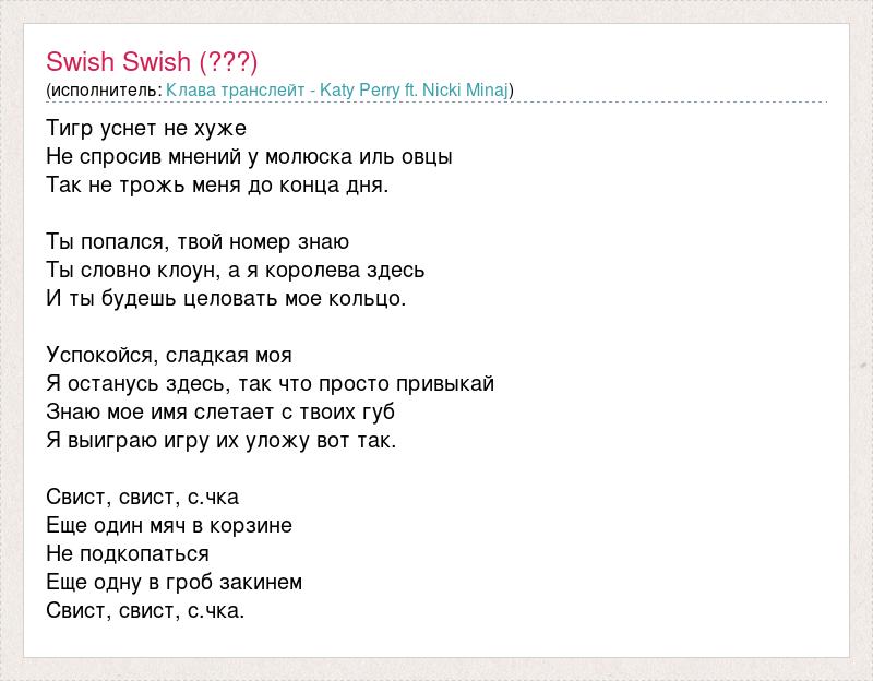 Тигр уснет не хуже Не спросив мнений у молюска иль овцы Так не трожь меня до конца дня. Ты попался, твой номер знаю Ты словно клоун, а я королева здесь И ты будешь целовать мое кольцо. Успокойся, сладкая моя Я останусь здесь, так что просто привыкай Знаю мое имя слетает с твоих губ Я выиграю игру их уложу вот так. Свист, свист, с.чка Еще один мяч в корзине Не подкопаться Еще одну в гроб закинем Свист, свист, с.чка.