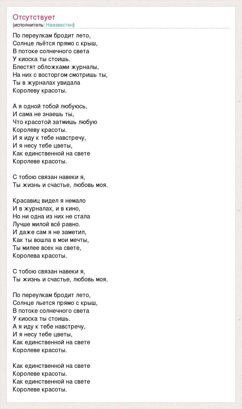 По переулкам бродит лето, Солнце льётся прямо с крыш, В потоке солнечного света У киоска ты стоишь. Блестят обложками журналы, На них с восторгом смотришь ты, Ты в журналах увидала Королеву красоты. А я одной тобой любуюсь, И сама не знаешь ты, Что красотой затмишь любую Королеву красоты. И я иду к тебе навстречу, И я несу тебе цветы, Как единственной на свете Королеве красоты. С тобою связан навеки я, Ты жизнь и счастье, любовь моя. Красавиц видел я немало И в журналах, и в кино, Но ни одна из них не стала Лучше милой всё равно. И даже сам я не заметил, Как ты вошла в мои мечты, Ты милее всех на свете, Королева красоты. С тобою связан навеки я, Ты жизнь и счастье, любовь моя. По переулкам бродит лето, Солнце льется прямо с крыш, В потоке солнечного света У киоска ты стоишь. А я иду к тебе навстречу, И я несу тебе цветы, Как единственной на свете Королеве красоты. Как единственной на свете Королеве красоты. Как единственной на свете Королеве красоты.
